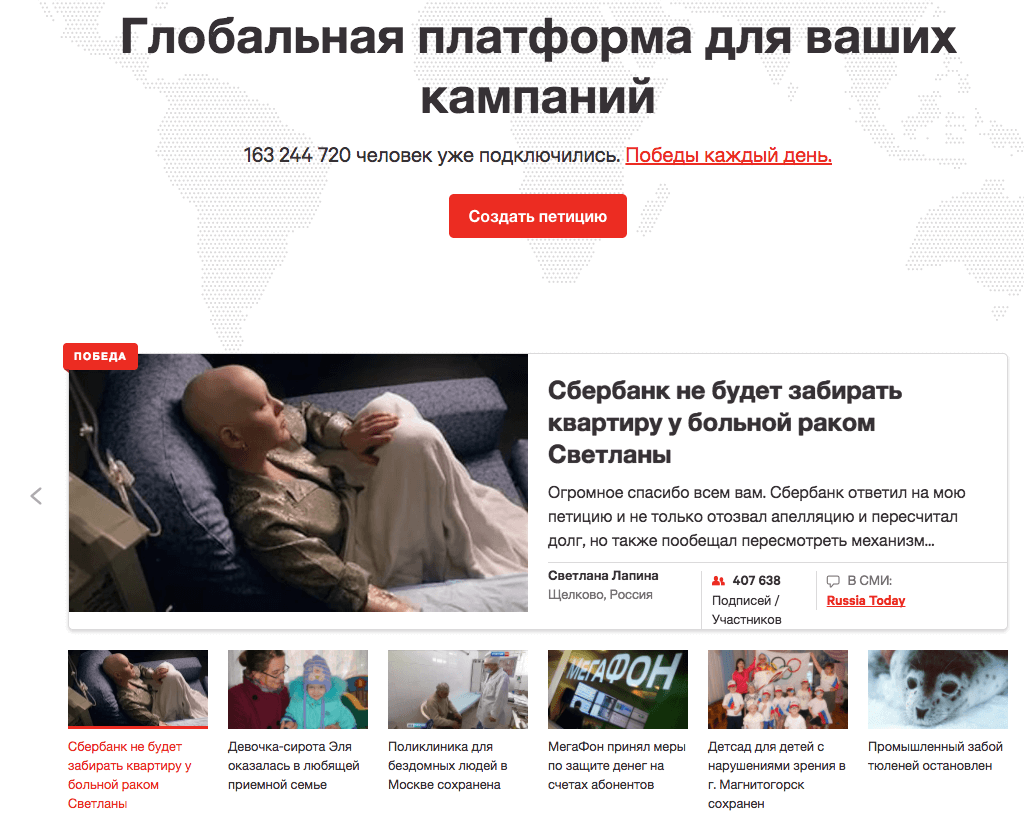 Дает пользователям возможность запускать кампании для мобилизации сторонников по беспокоящим их вопросам. Крупнейшая в мире платформа для онлайн-петиций. Не так давно Change добавил для своих пользователей возможность сбора средств с помощью краудфандинга.