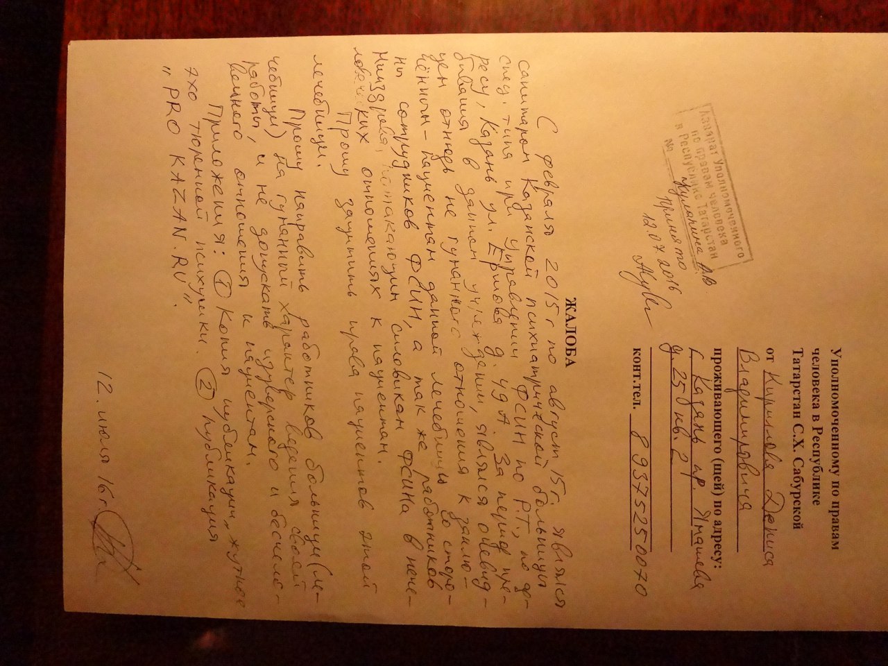 – В аппарате уполномоченного по правам человека РТ мне подтвердили, что получили жалобу от вас и направили ее в прокуратуру.