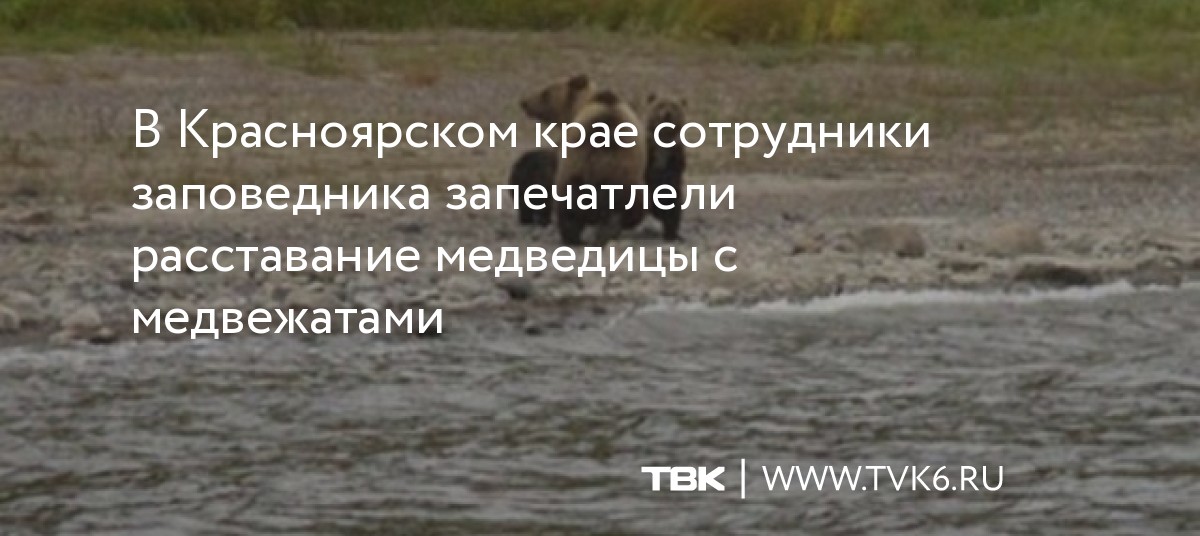 «Редкие кадры удалось запечатлеть инспекторам заповедника "Центральносибирский". На кордон "Лебедь" пришла медведица со взрослыми медвежатами.На глазах инспектора разыгралась целая драма. Мама-медведица переплыла Енисей и скрылась на другом берегу реки. Медвежата еще два дня ходили по берегу. Позже они скрылись в лесной чаще».