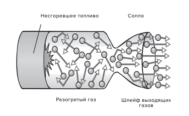 К моменту выхода из сопла исходная энергия газа почти полностью переходит в кинетическую, а скорость газового потока направлена прочь от сопла. Однако поскольку газ продолжает гореть даже после выброса из сопла, его кинетическая энергия и скорость растут до фантастических величин. Благодаря конструкции сопла Лаваля скорость истечения реактивной газовой струи — то есть скорость направленного назад потока газов, выходящего из двигателя ракеты, — достигает значений от 10 000 до 16 000 км/ч.