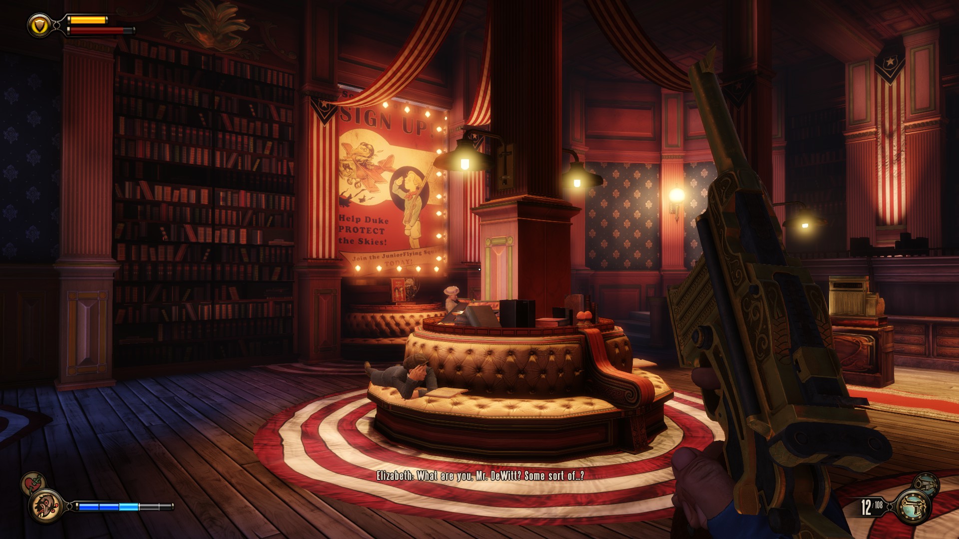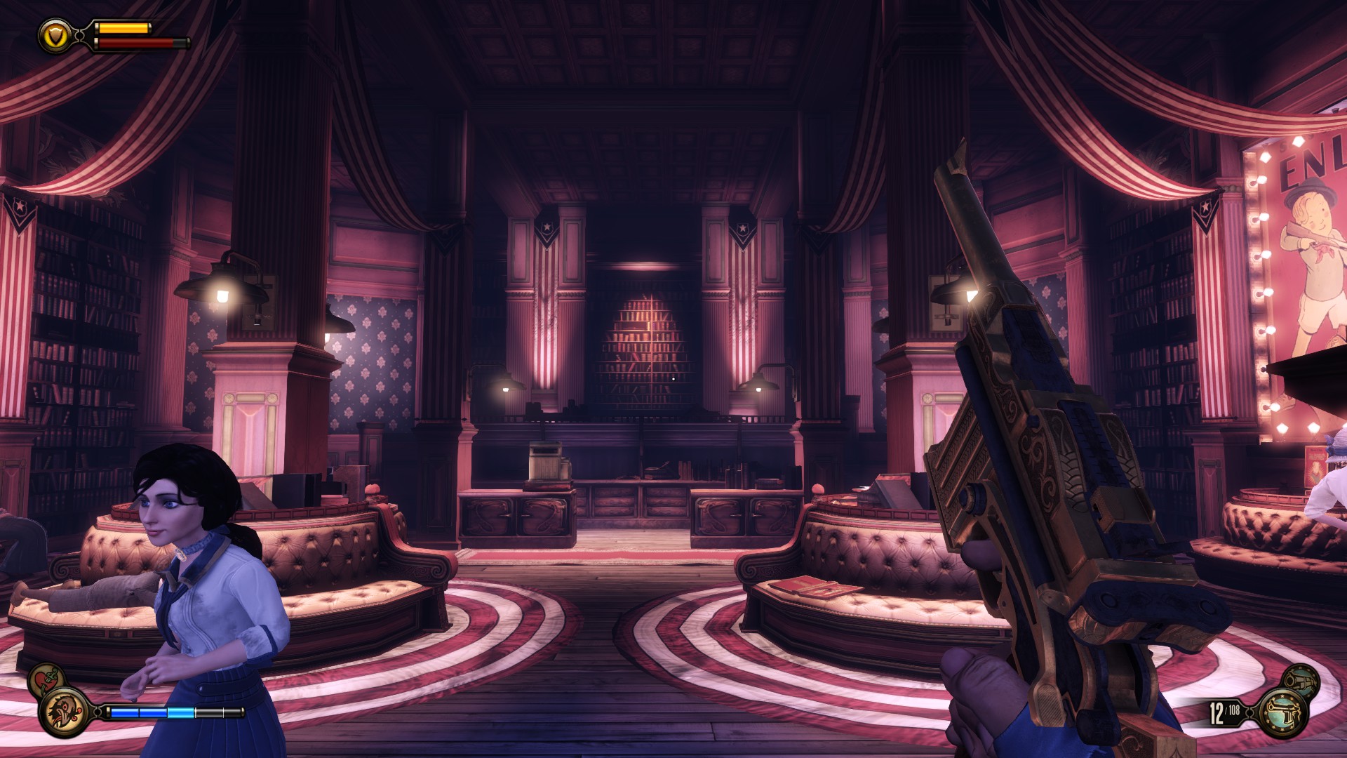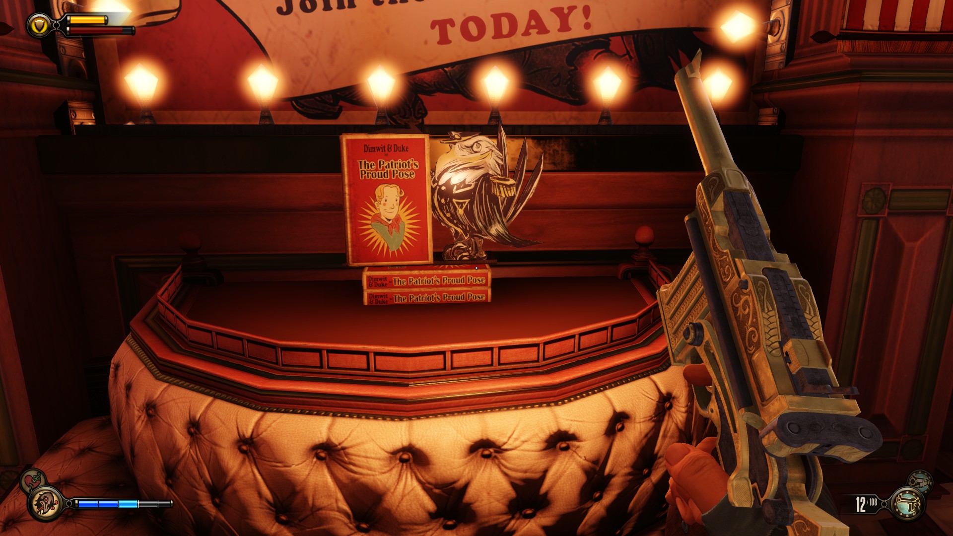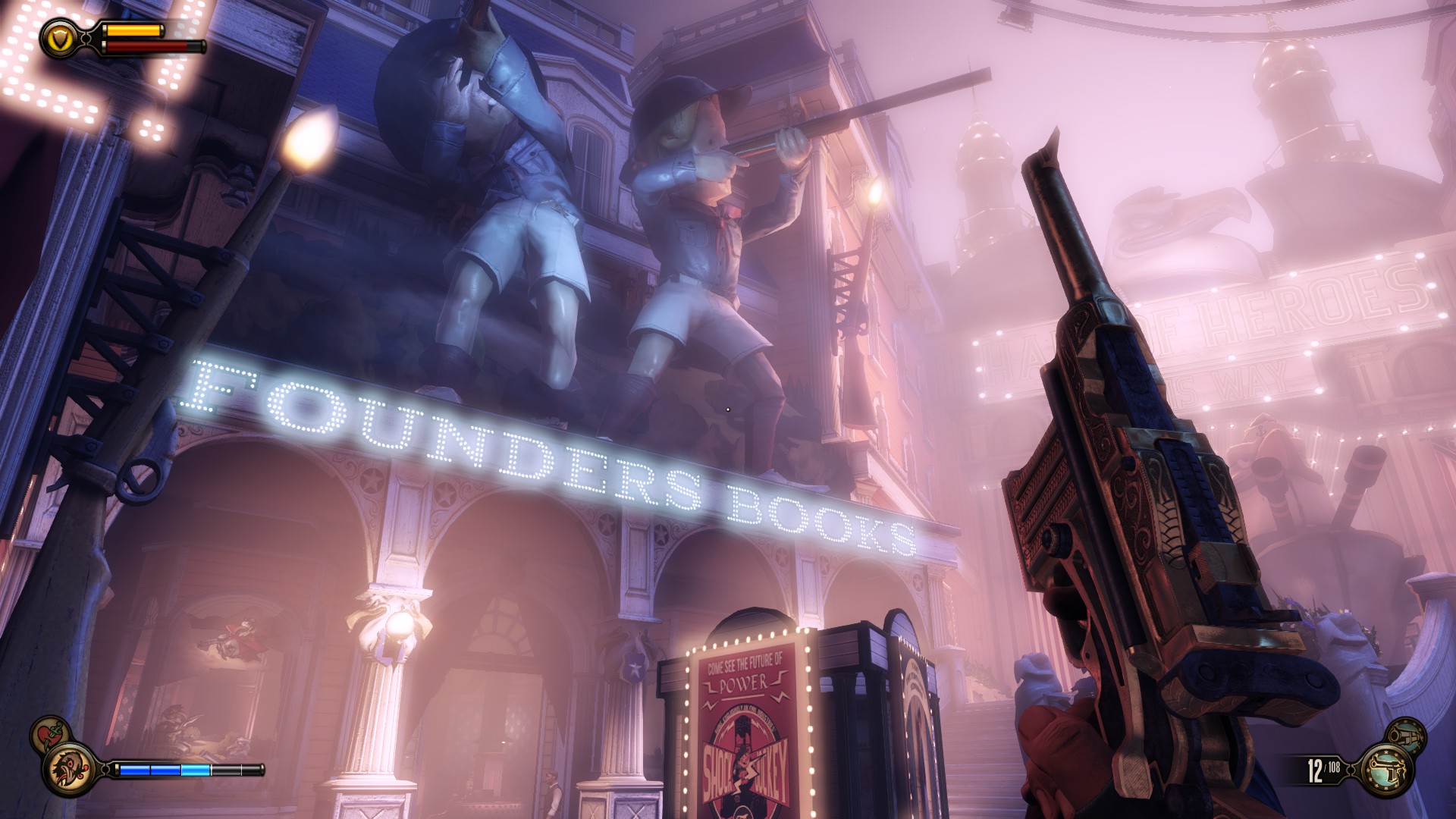 Founders Books — это сетевой книжный магазин, неоднократно встречающийся на нашем пути по Колумбии. Он назван в честь партии Основателей (Founders), возглавляемой пророком и главным антагонистом игры Захарией Комстоком. Магазин торгует шовинистической литературой, в том числе предназначенной для детей. В тот момент, когда мы заходим в FB, в нем рекламируется бестселлер с названием «Гордая поза патриота» (The Patriot’s Proud Pose), на плакате изображен скаут, который целится из ружья в карикатурных представителей «иностранных орд». Гори, магазин, гори, в огне революции!