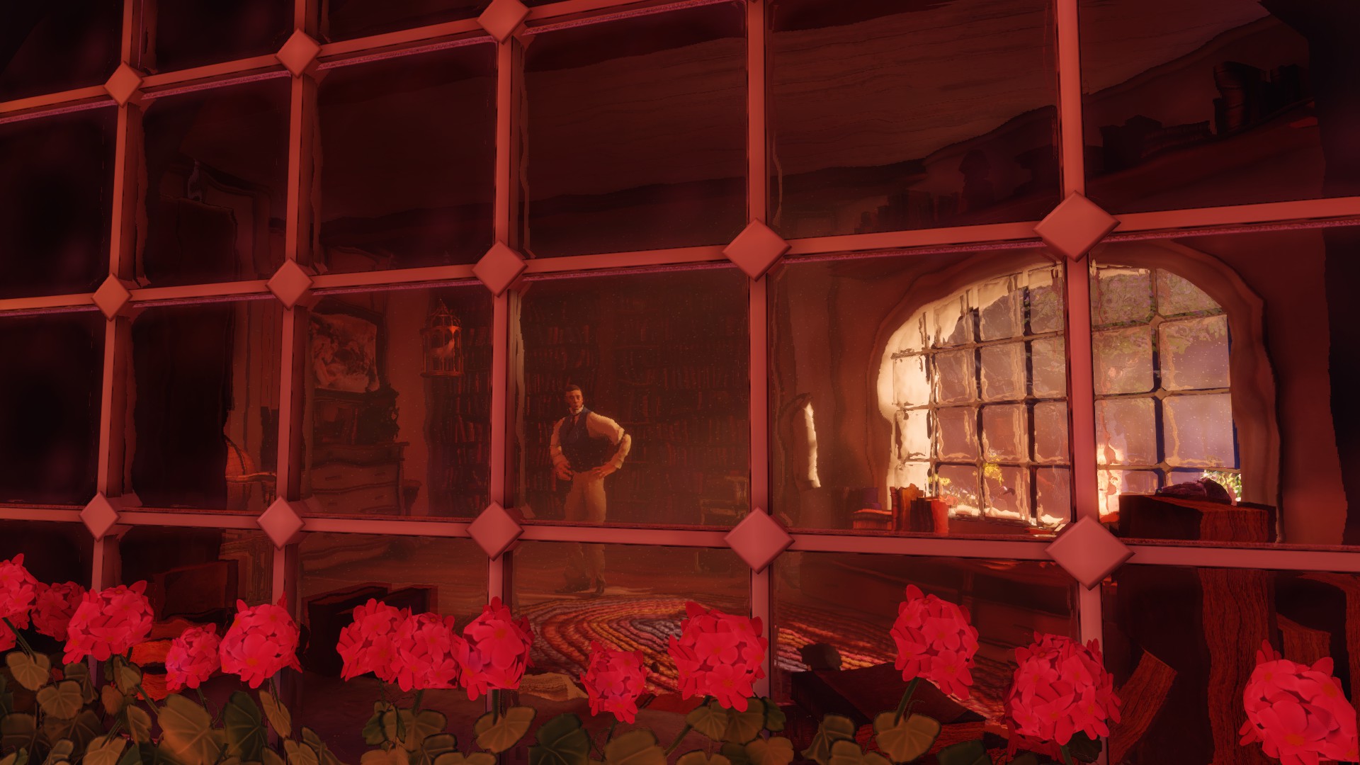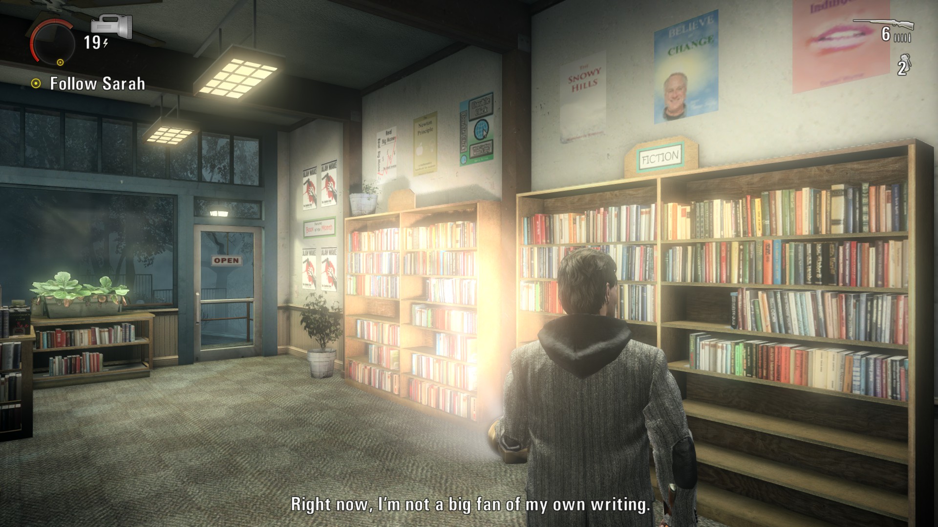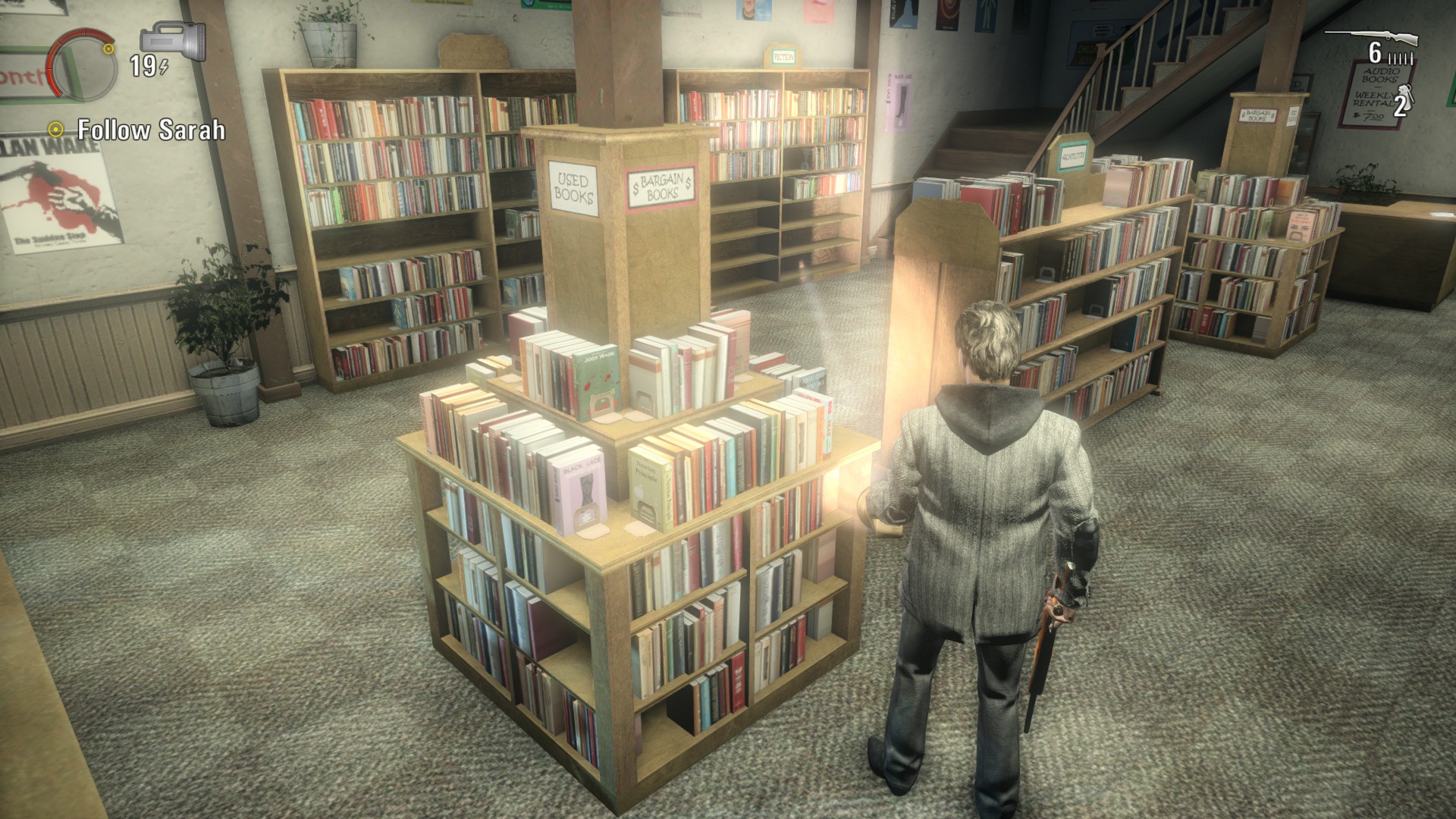 Такая игра, само собой, не может обойтись без книжного магазина, и к ее середине мы попадаем в двухэтажный городской магазинчик без названия. Тем не менее, это довольно уютное место: ковролин, большие окна, деревянные стеллажи, комнатные растения, стулья и столы для чтения. Также в магазине проходит акция — две книги по цене одной, и есть несколько стеллажей с уцененными книгами. Дела, видимо, идут не очень.