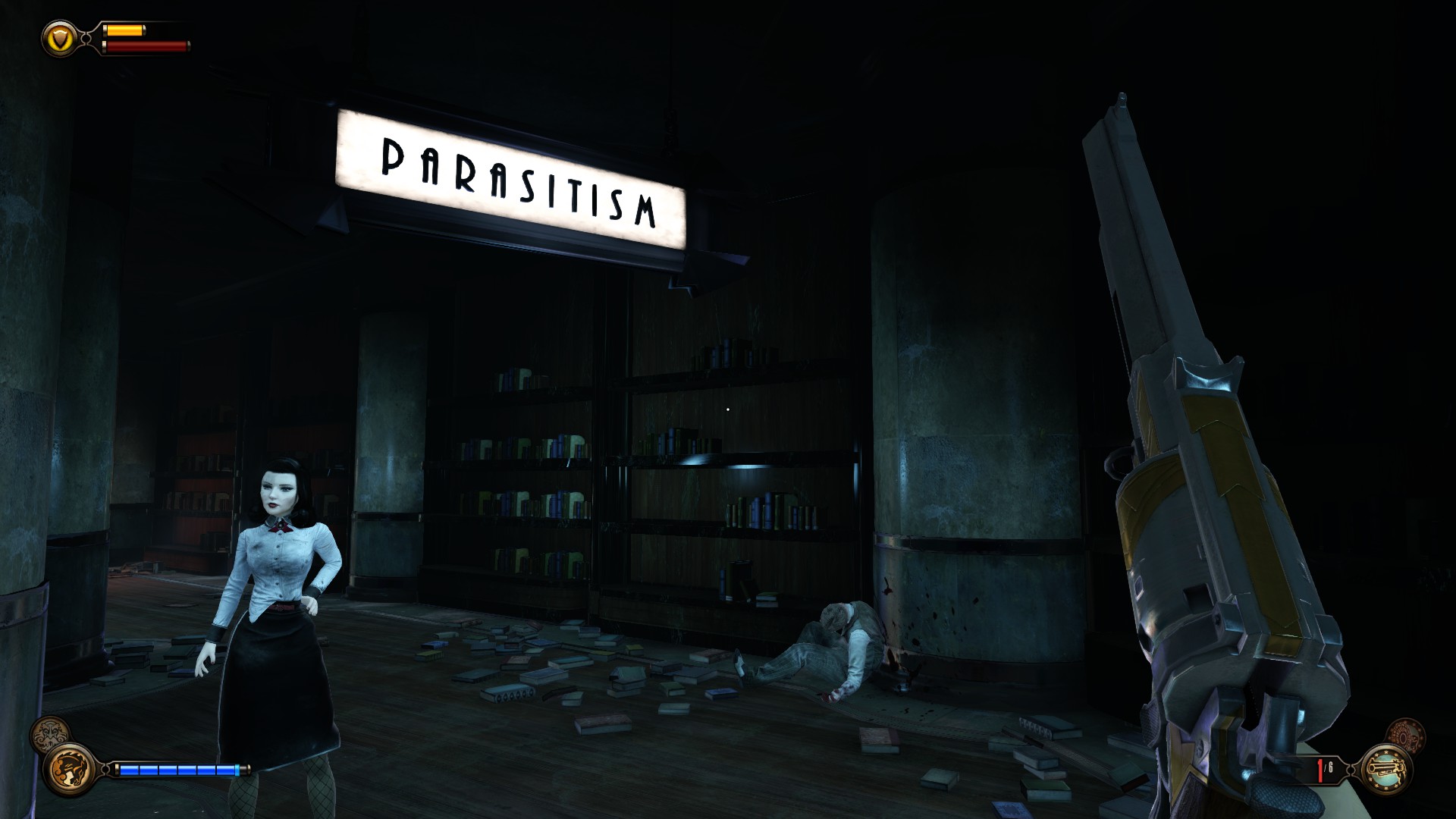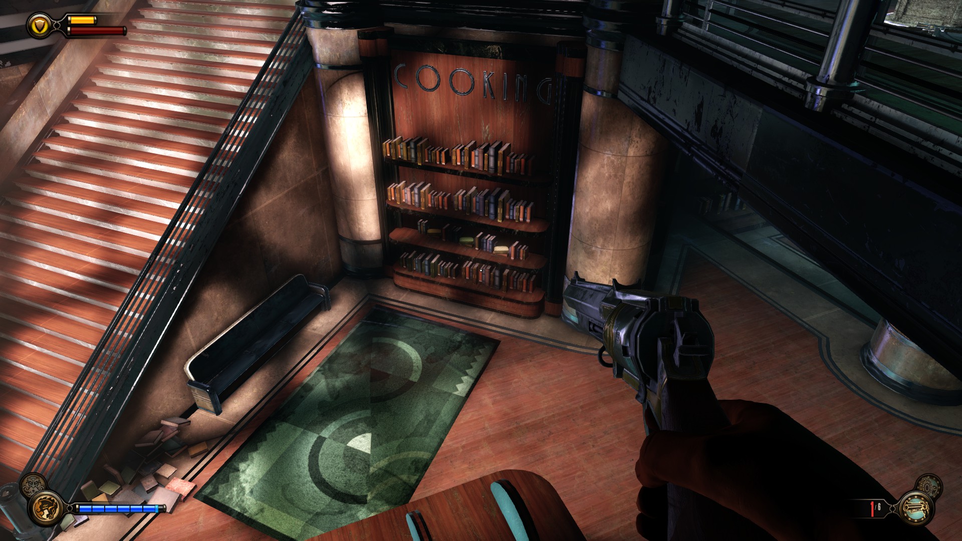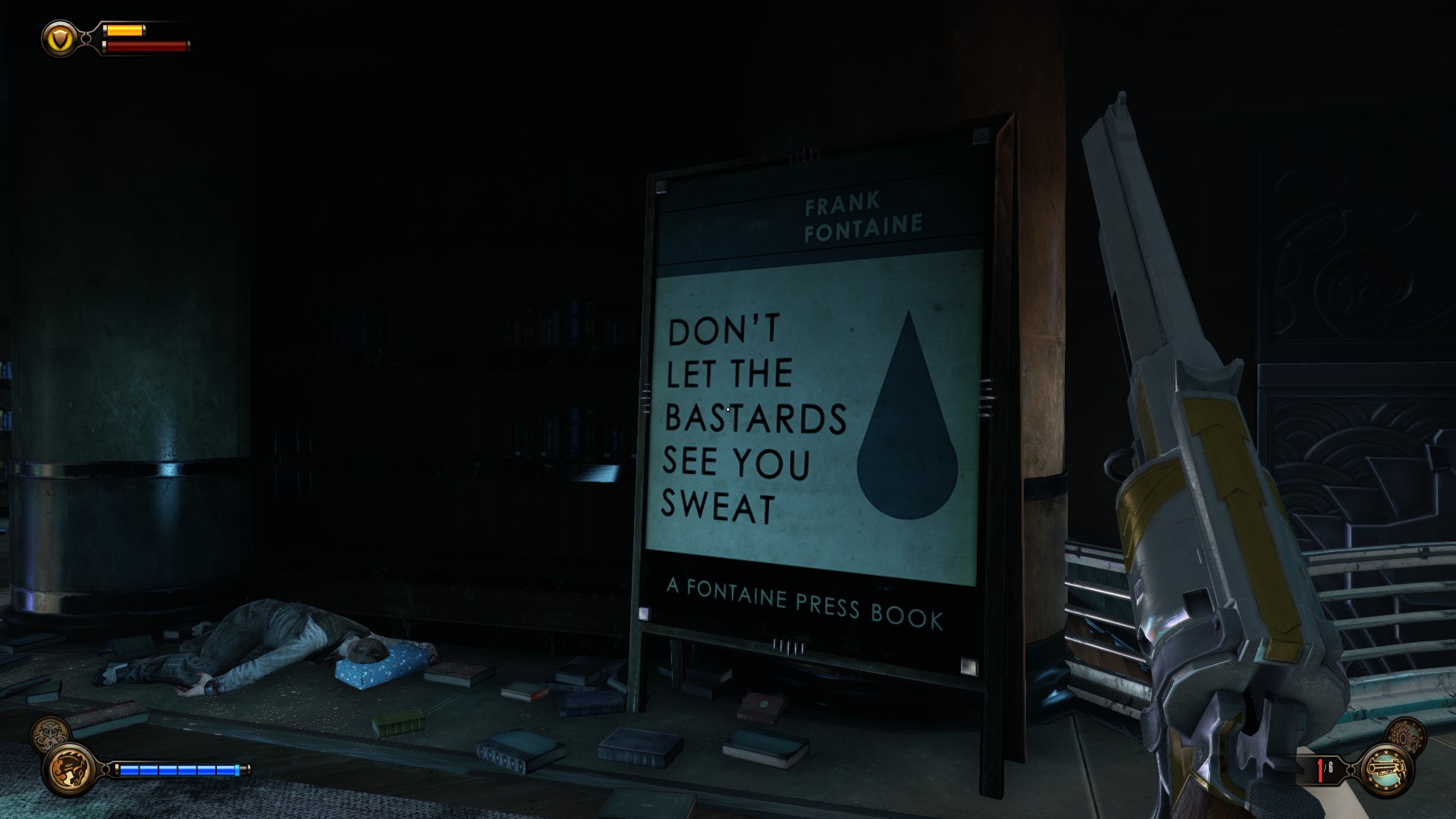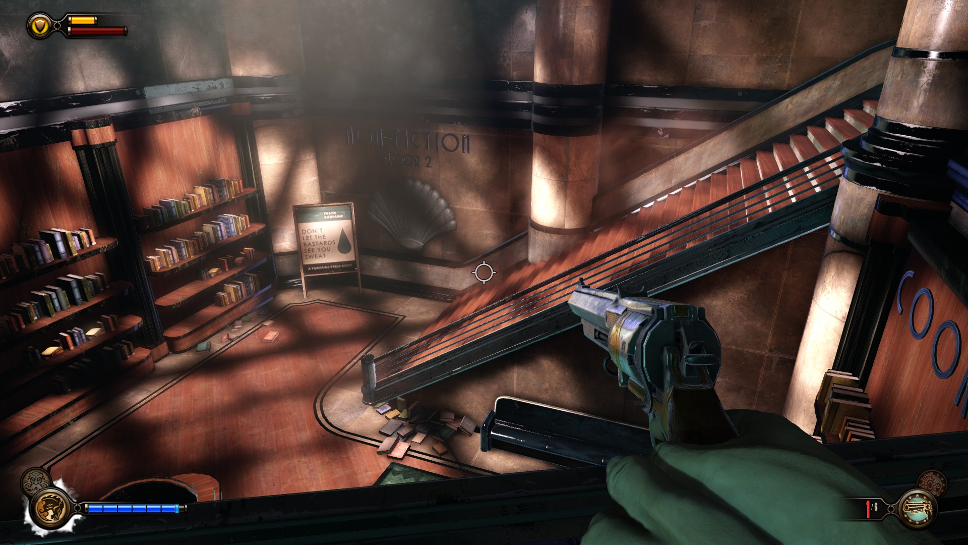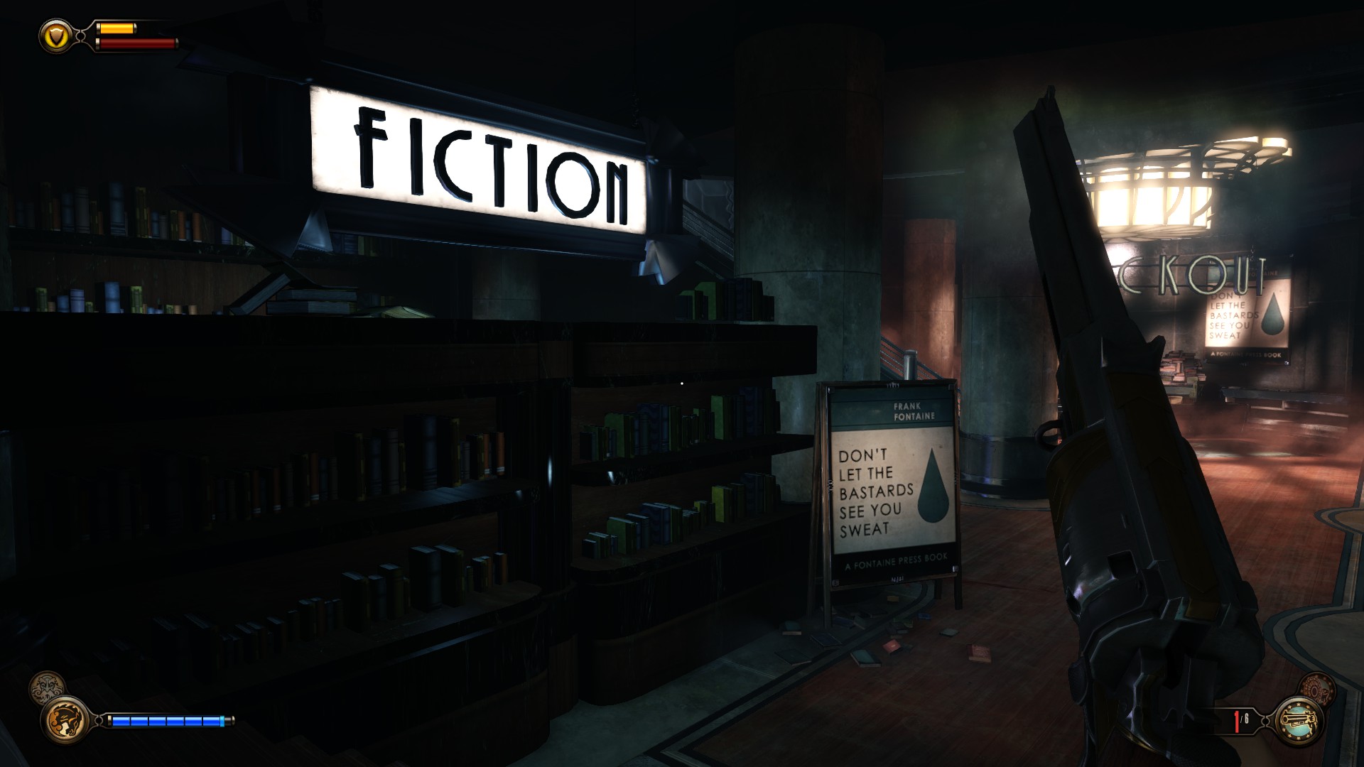 Мы попадаем в затопленный универмаг в поисках пропавшего ребенка. Собственно, здесь и обнаруживается книжный магазин. Среди вполне привычных отделов кулинарии, искусства и художественной литературы встречаются отделы «Паразитизм», «Эмпиризм» и «Самооптимизация» — важные для либертарианского общества Восторга темы. Также магазин настойчиво предлагает бестселлер с названием «Не дай подонкам увидеть, как ты потеешь» («Don’t let the bastards see you sweat»). Неплохое название для книги издательства «Манн, Иванов и Фербер».