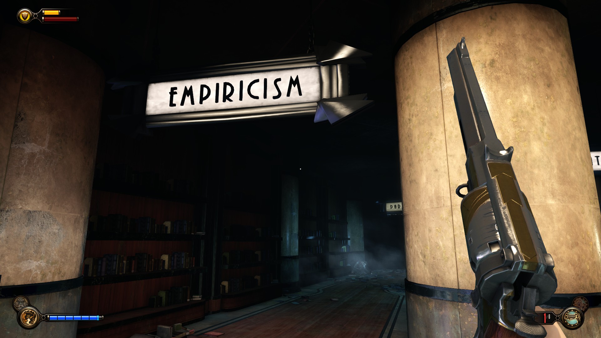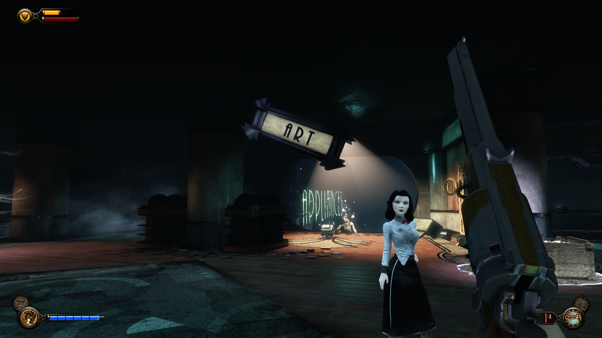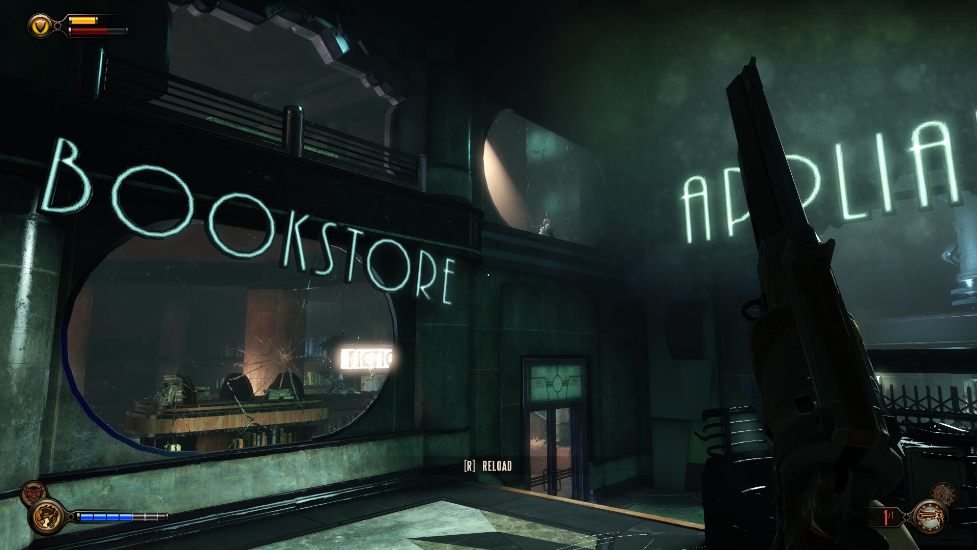 Начнем с великой классики и заглянем в магазин из подводного города Восторг (Rapture). Восторг построил промышленник-миллиардер Эндрю Райан, сторонник свободного рынка и философии объективизма. Оправдывая название, город сверкает огнями, полированной сталью и стеклянным кирпичом позднего ар-деко. Джаз и живопись Тамары Лемпицки, роскошь, самоуверенность и небывалые технологии. Просуществовав несколько лет как либертарианская утопия, Восторг постепенно начинает приходить в упадок. Стремительно растет имущественное неравенство, появляется безработица. Запрет на религию стимулирует контрабандную торговлю, преступник-психопат Фрэнк Фонтейн зарабатывает свой первый капитал на продаже библий. Общество, оказавшись в изоляции на дне океана, начинает съезжать с катушек, появляется новый генномодифицирующий и сводящий с ума наркотик Адам. Таинственным образом начинают пропадать маленькие девочки. Фонтейн притворяется народным лидером Атлантом и, используя антикапиталистическую риторику, поднимает бедняков на восстание. Райан отвечает кровавой полицейской реакцией. Начинается гражданская война: по улицам мечутся в бреду мутировавшие жители, снуют полицейские дроны, вендинговые машины продают на каждом шагу дешевые патроны и дорогую еду. Закончится все это боем с Фонтейном, который к тому времени превратится в копию статуи Атланта из Рокфеллеровского центра. А пока — полиция Райана блокирует мятежников в роскошном универмаге, который отправляют на дно совсем уже маракотовой бездны.