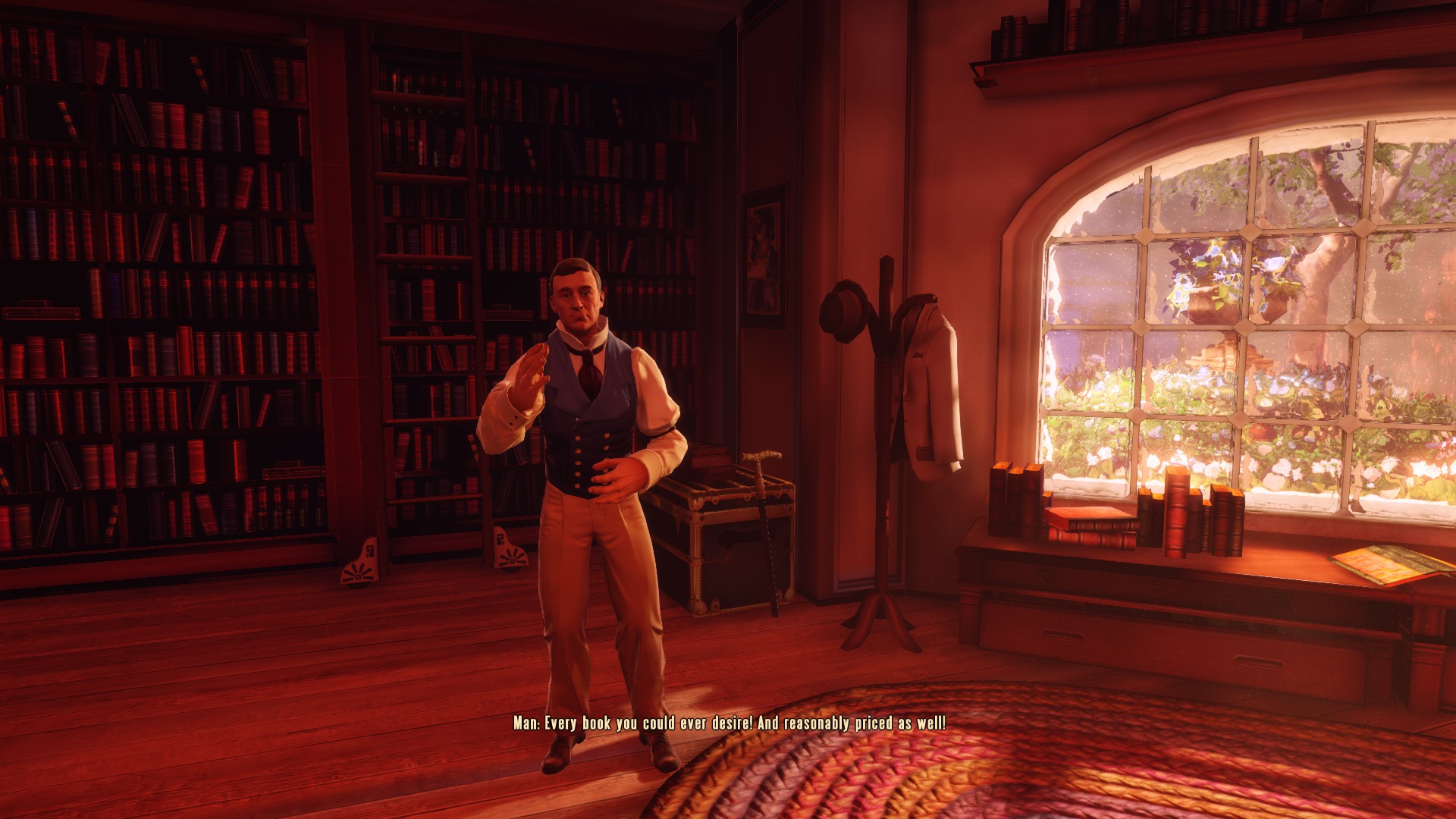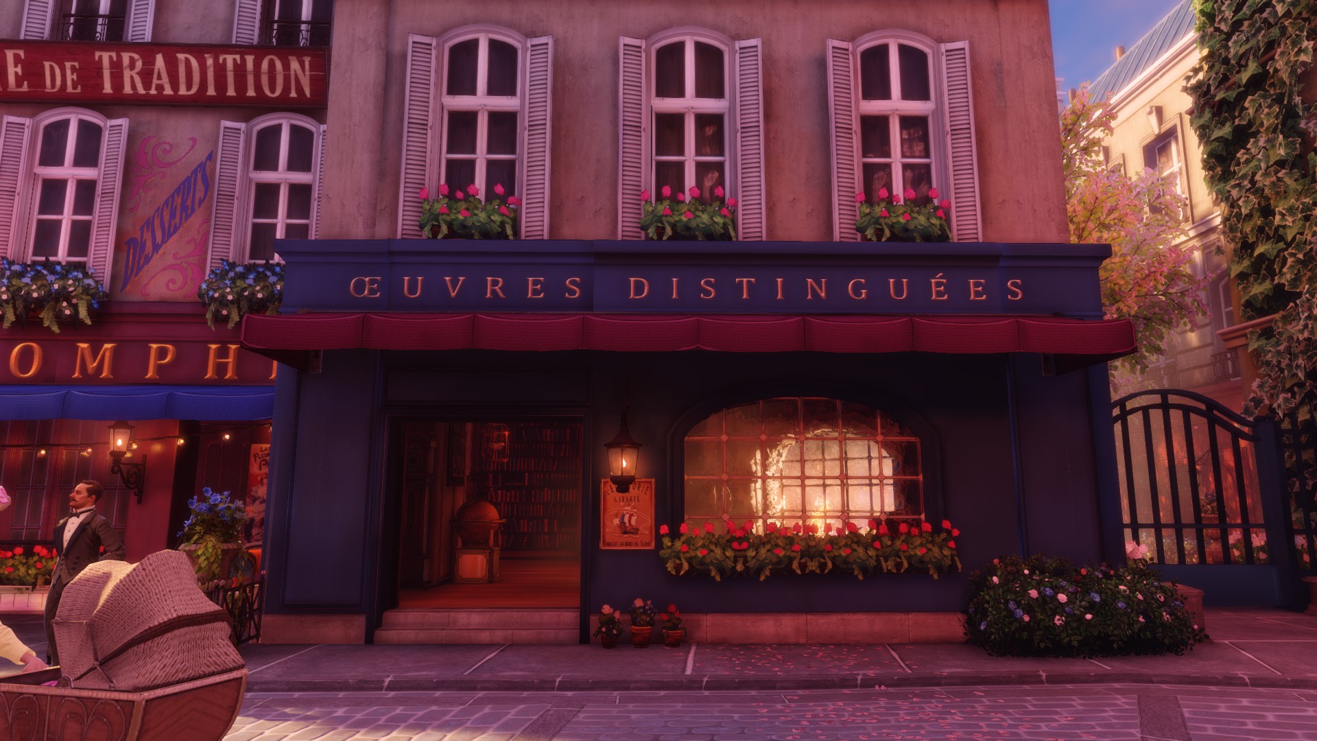 В другом месте Bioshock героиня Элизабет, молодая леди, выросшая в библиотеке, видит сон о Париже. Вино, сыры, дети, танцующие в обнимку с багетами, Эдит Пиаф и идеальный книжный магазин с названием Œuvres distingues. Магазин продает книги о путешествиях, наполнен солнцем, на коврике тихо дремлет котик. Наш выбор!