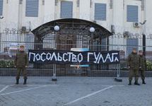 Между тем живущий на Украине политбеженец Сергей Крюков сообщил "Граням", что утром в понедельник он вместе с коллегами по киевскому отделению Международного комитета защиты Стомахина - Михаилом Агафоновым и Наталией Горильской - провел у российского посольства акцию протеста против готовящейся отправки публициста в тюрьму. Активисты повесили на ограду дипмиссии растяжку с надписью "Посольство ГУЛАГа" и возложили рядом венок из колючей проволоки, а также двуглавого петуха, сделанного из игрушек для собак.