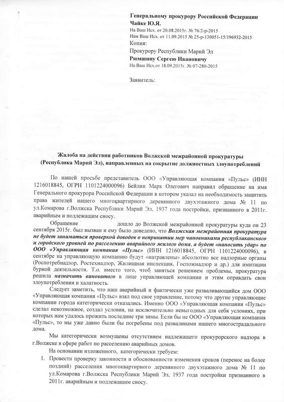 Жить в разваливающемся неотапливаемом доме нельзя. Приходится жаловаться. Куда? В прокуратуру, понятное дело. Но Волжская прокуратура готова войти в положение не только жильцов, но и администрации – раз не расселяет, значит, не может. А посему нашла виновного в лице управляющей компании – мол, плохо управляет. Прокуратура провела расширенное совещание по этому вопросу, показательно выпорола руководителя управляющей компании путем денежного штрафа и… все на этом. Запал кончился. Живите дальше, как хотите.