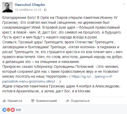 Что же происходит сегодня? Губернатор Орловской области Вадим Потомский в ходе открытия памятника почти дословно воспроизводит тезисы царебожников из церковной среды, в особенности, снычевско-душеновского «Самодержавия духа», говоря о том, что «Грозный — великий первый русский царь, который очень сильно оболган под диктовку наших европейских ‘партнеров’», «история, касающаяся Ивана Грозного, умышленно переписывалась», а убийство царем своего сына — художественный вымысел.