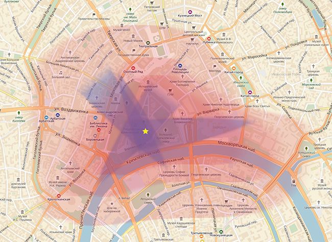 Программист предположил, что на территории Кремля находится источник радиоволн, который с помощью специальных программно-аппаратных комплексов имитирует работу спутника навигационных систем и отправляет сигналы на частотах, которые чаще всего используют бытовые навигаторы. Сделав замеры на направление источника сигнала (синие области на карте) в разных точках вокруг Кремля, Бакунов предположил, где конкретно может находиться «глушилка» (на карте обозначено звездой).