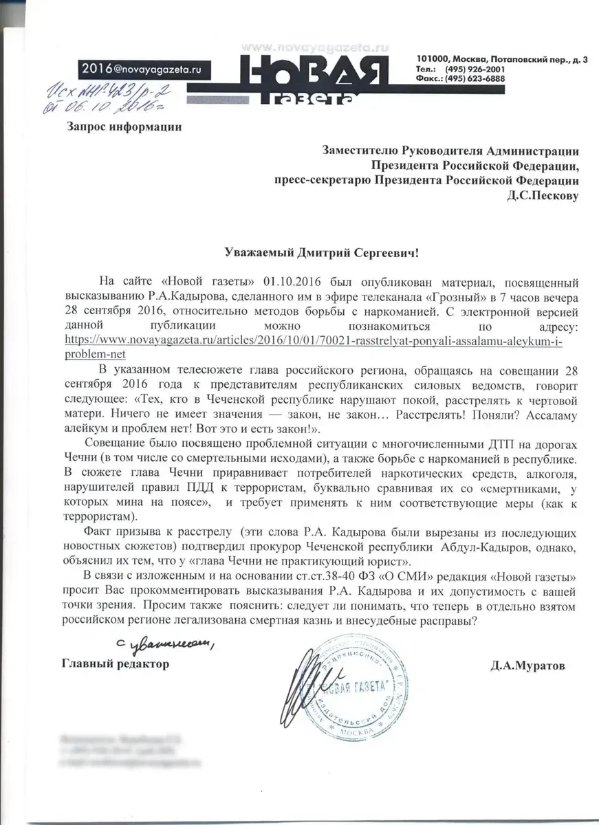 1 октября «Новая газета» опубликовала аудиофрагмент из сюжета грозненского телевидения о совещании Рамзана Кадырова с местными силовиками, чиновниками и духовенством. Напомним, во время совещания Кадыров приравнял наркоманов и виновников ДТП в Чечне к террористам и заявил: «Тех, кто в Чеченской республике нарушают покой, расстрелять к чертовой матери. Ничего не имеет значения — закон, не закон… Расстрелять! Поняли? Ассаламу алейкум и проблем нет! Вот это и есть закон!»