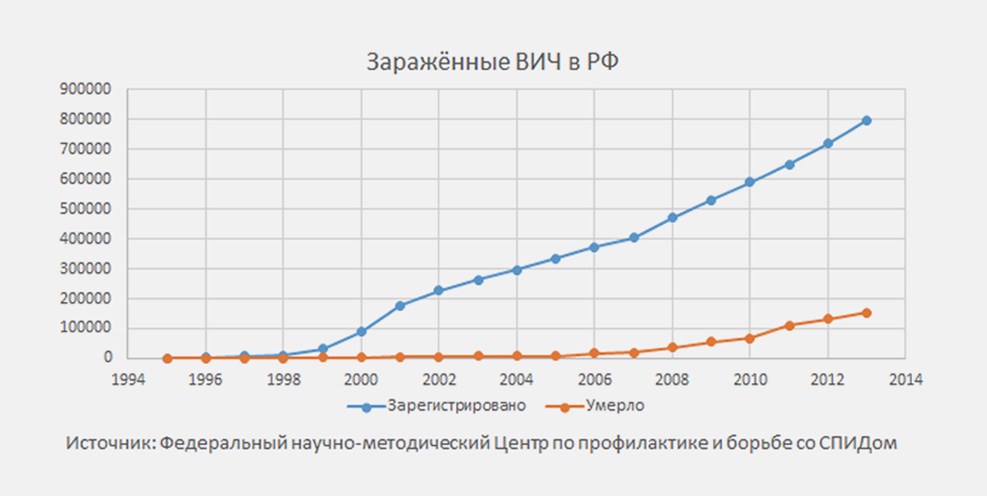 России грозит не гибель в мировой войне, а деградация. Стоит только посмотреть на официальные данные по СПИДу, и график наглядно показывает, что как раз в 1999 году, когда Путин пришел к власти, страна стала уверенно подниматься с колен и шагать по пути вырождения.