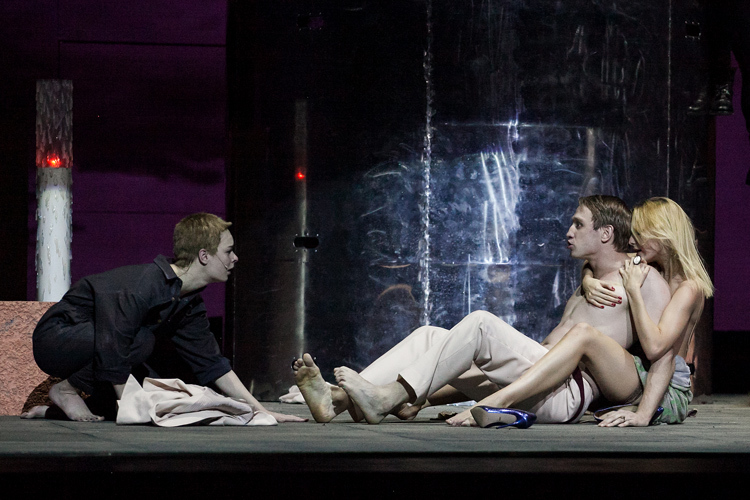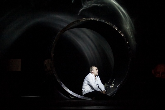 Только во втором акте, когда безмолвная Ивонна начинает рассказывать о себе с помощью терменвокса — электроинструмента, созданного в 1920 году Львом Терменом, реагирующего на малейшие колебания и извлекающего музыку буквально из воздуха, — мы начинаем догадываться, что вся сценическая коробка и была таким терменвоксом. Зоной, в которой звучит безмолвие, или само подсознание, вытесненное, прямо по Лакану, репрессивной машиной языка. До того скрытый в кулисах механизм локализуется на сцене как инструмент, из которого Ивонна извлекает музыку, столь же тотальную, как и все ее андрогинное существо с огромными глазами и шапочкой стриженых белых волос.