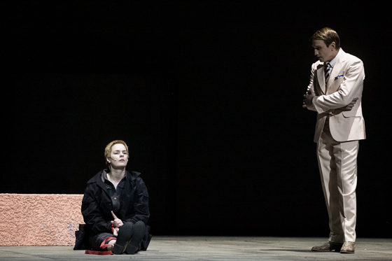 Тотальность ее присутствия посреди киберпустыни — тема спектакля, общество которого составляют оболочки-симулякры. Здесь придворные дамы носят шляпки, сросшиеся с головами, у Камергера (Сергей Епишев) лицо и вовсе обросло прозрачной маской, силиконовой прослойкой между человеком и миром, а королева Маргарита (Агриппина Стеклова) в ночном истероидном порыве откровения разоблачается до силиконовой наготы, обнаруживая под одеждой ханжеское тело-маску, оболочку такой же силиконовой души. Королю (Алекандр Феклистов) маска и вовсе не нужна — там вместе с короной к телу приросли трусы и майка: не властелин, а затравленный обыватель, более всего боящийся самого себя.