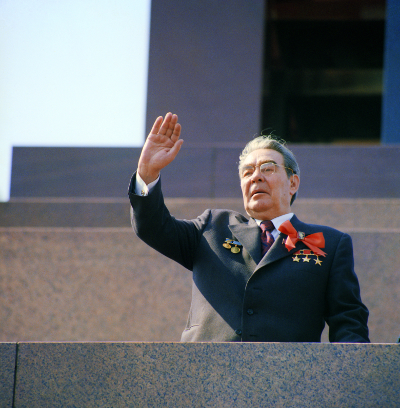 Генсек ЦК КПСС Леонид Брежнев встречает первомайскую демонстрацию, 1977 год