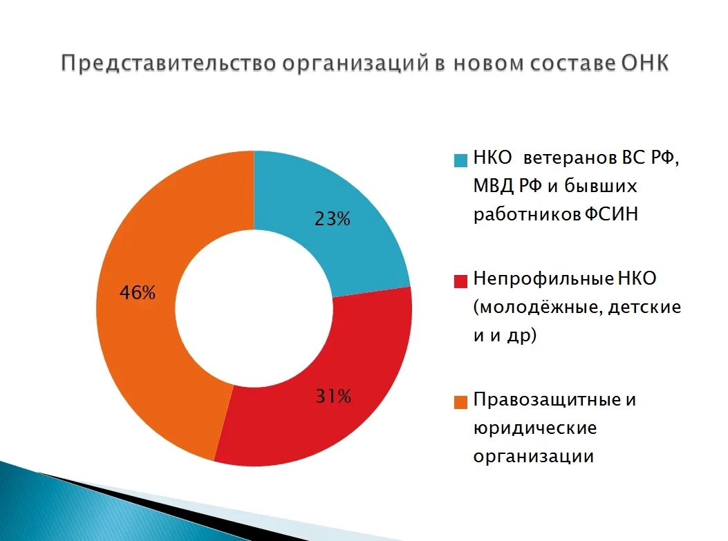 Вот статистика представителей организаций в новом составе ОНК: 23% — НКО ветеранов Вооруженных сил РФ, МВД РФ и бывших работников ФСИН, 31% — непрофильные НКО (молодежные, детские и пр.), 46% — правозащитные и юридические организации. Например, среди прошедших в ОНК есть представитель Челябинской региональной общественной организации «Федерация черлидинга Челябинской области», причем с рекомендацией от Общественной палаты Челябинской области.