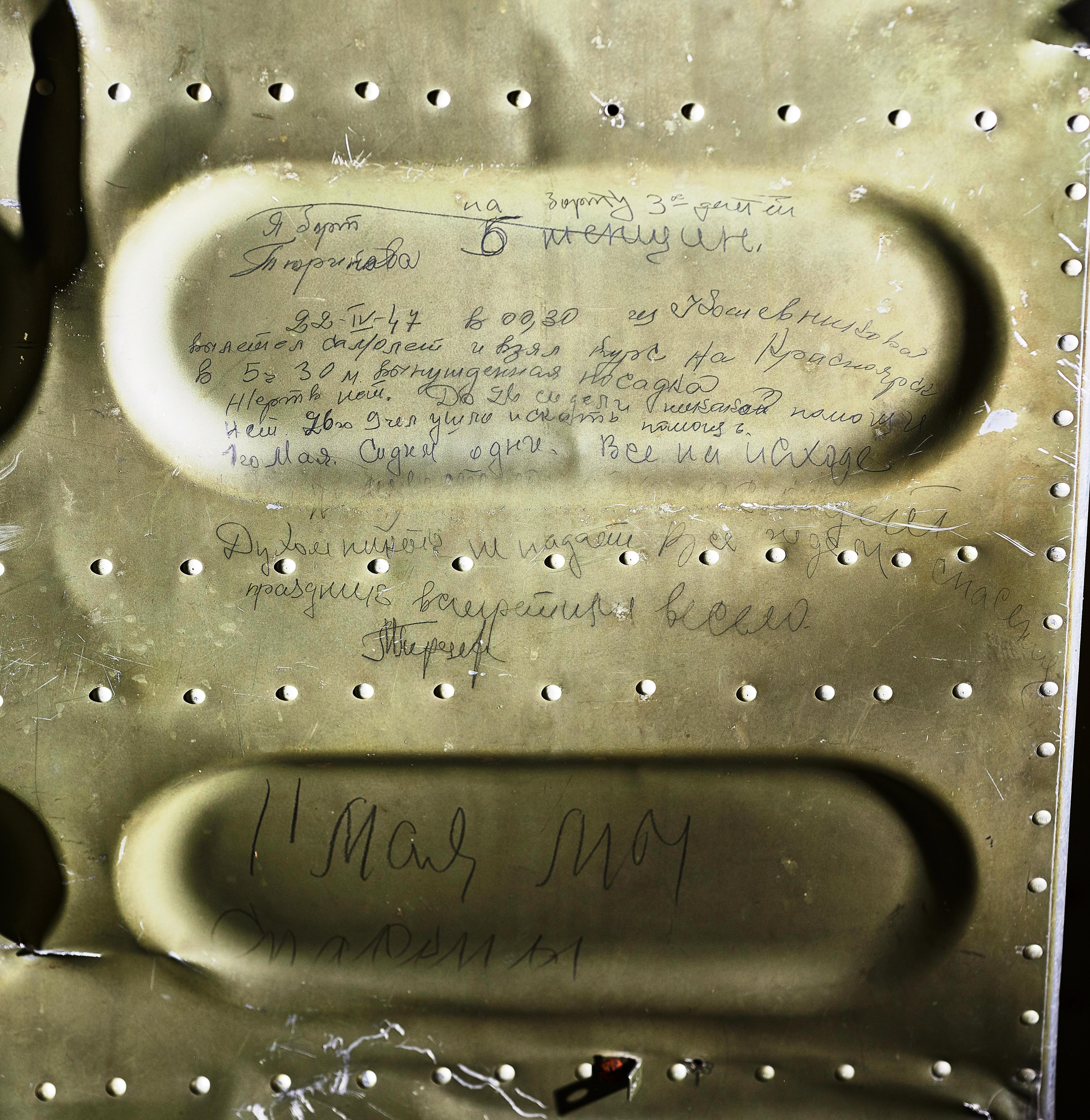 А еще участники экспедиции на обшивке внутри "Дугласа" нашли записи, сделанные химическим карандашом. Первая относится к 23 апреля 1947 года.