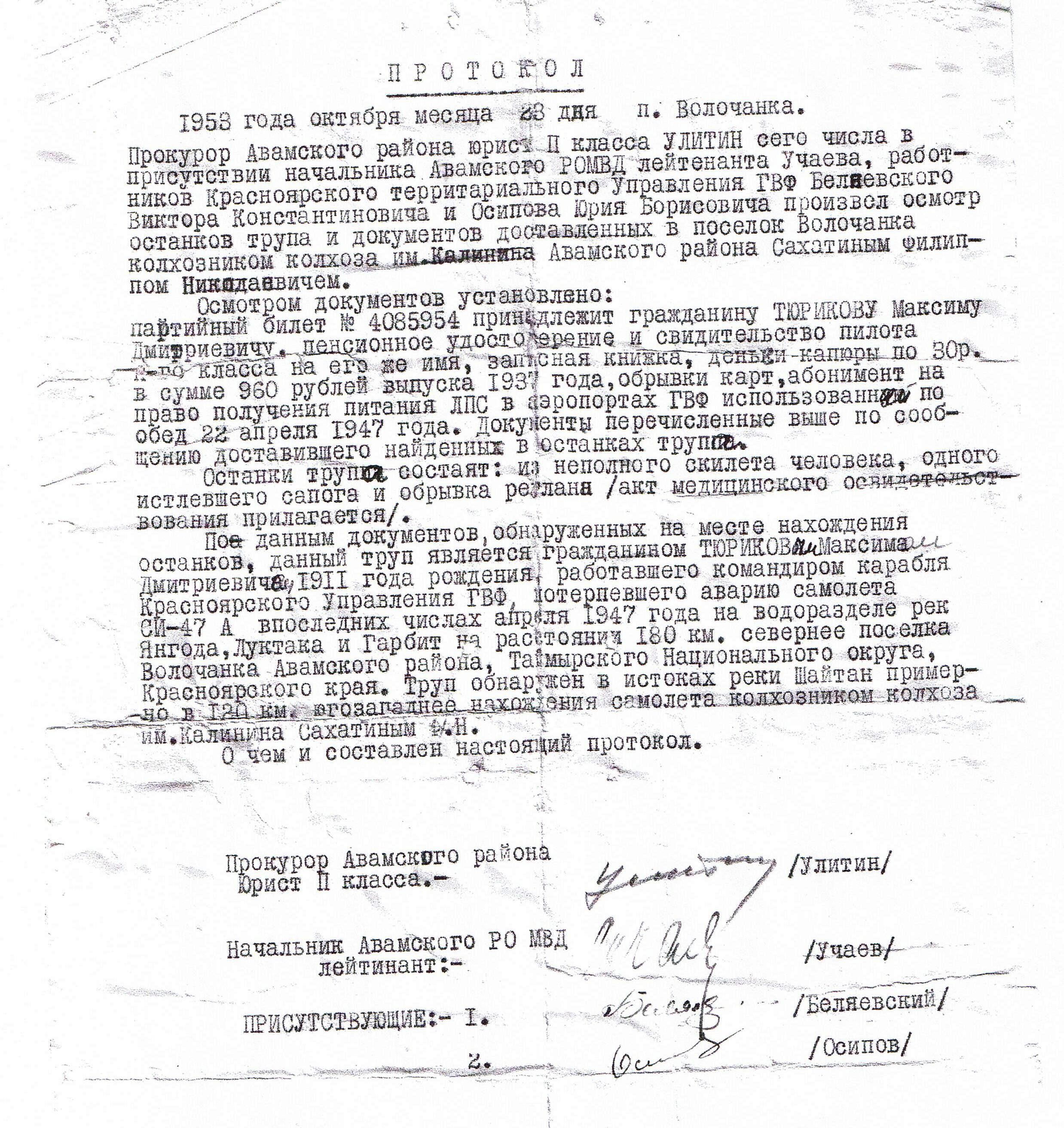 …Останки Тюрикова нашли только шесть лет спустя, в 1953 году. В 120 км от места крушения их случайно обнаружил местный охотник. Согласно протоколу, останки состояли из "неполного скелета, истлевшего сапога и обрывка реглана". Но документы – партбилет, свидетельство пилота, пенсионное удостоверение, талон на обед на 22 апреля 1947 года – все были на имя Тюрикова.