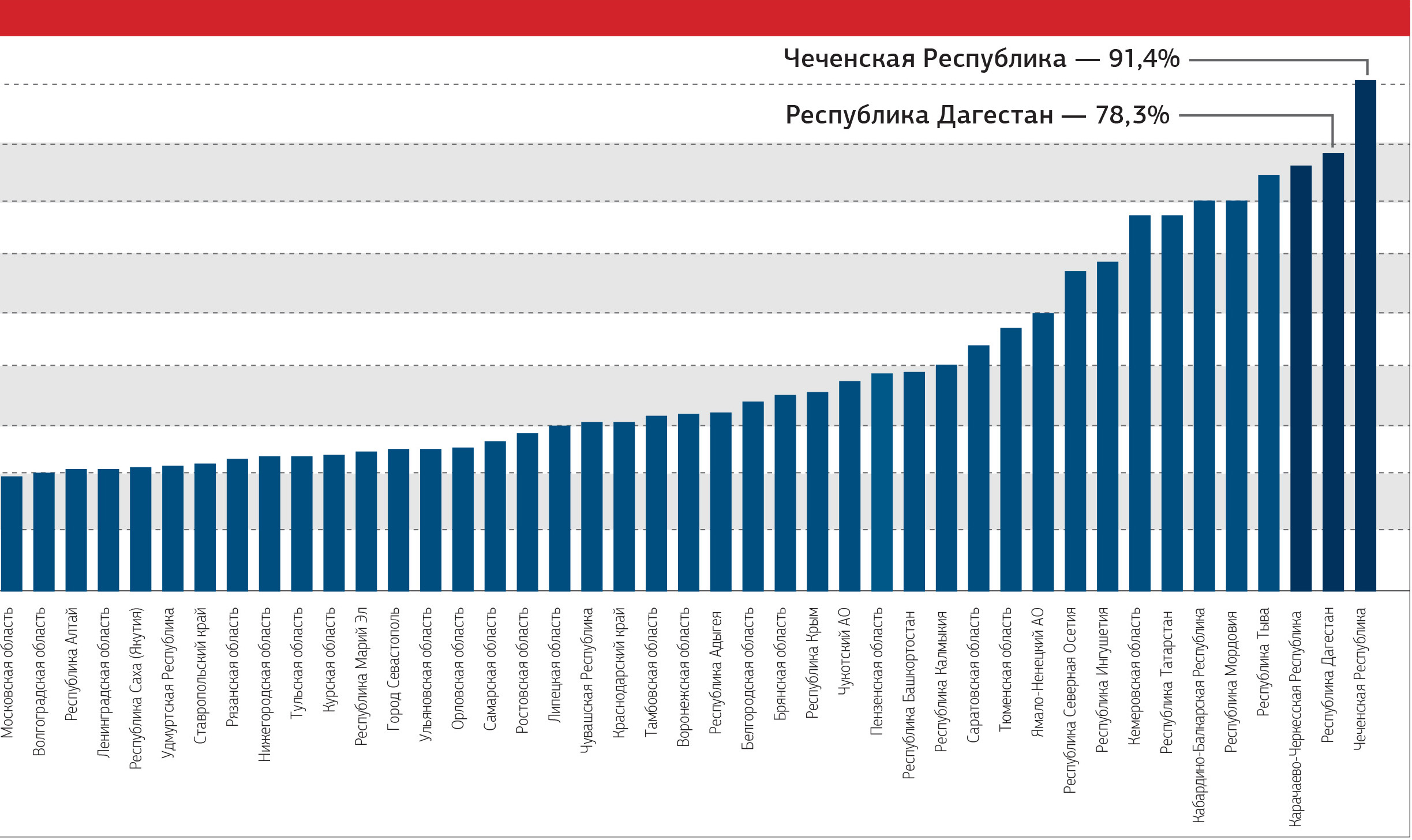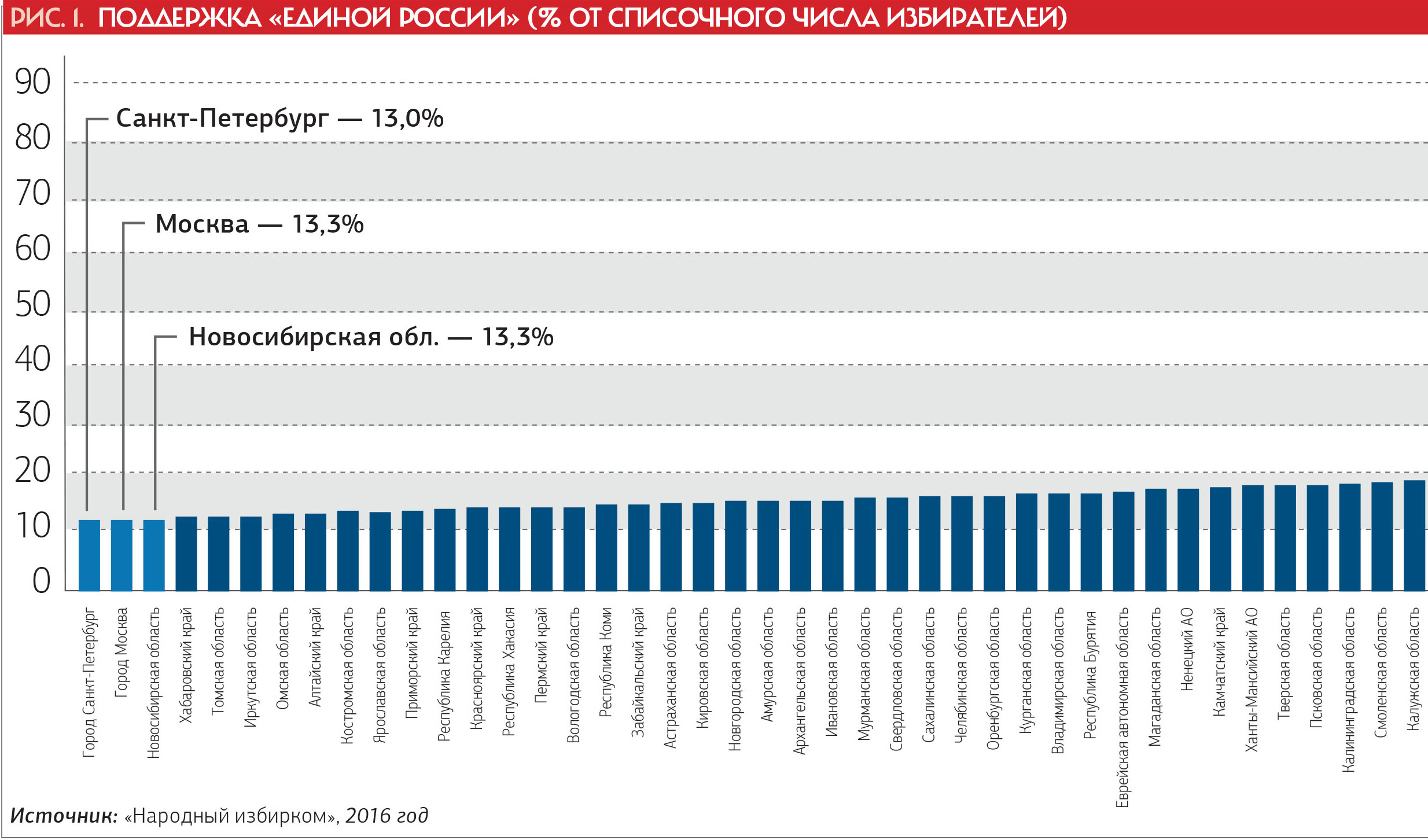 В половине регионов (рисунок 1, левая часть) партию власти поддержали менее 20% от списочного состава избирателей. Что это за земли? Городские, европеизированные, с отчетливым преобладанием русского населения. Чем столичней, тем ниже показатель лояльности: в Москве, Питере и Новосибирской области — 13% от общего числа избирателей. На противоположном конце рейтинга — «электоральные султанаты» во главе с Чечней и Дагестаном. Среди 11 субъектов Федерации, выдавших на-гора поддержку ЕР 50%+ от списка, — 10 национальных образований и Кемеровская область, давно известная как «народный султанат имени Амангельды Тулеева».