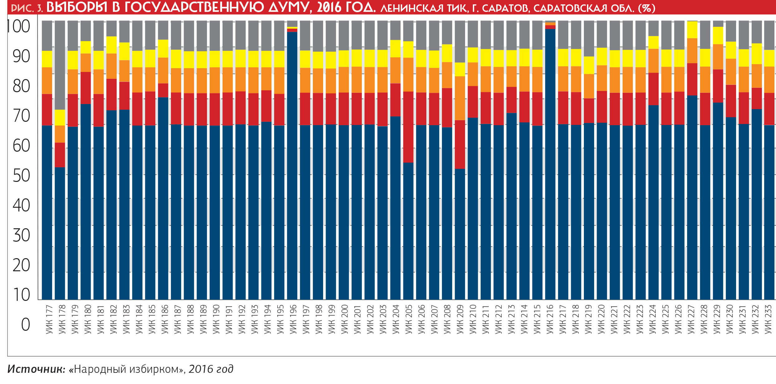 Вот как «голосовали» в черноземном Саратове (рисунок 3). В трех четвертях участков один и тот же результат не только за «ЕР» (те самые баснословные 62,5%), но и за КПРФ, ЛДПР, СР и «остальных». Чисто советское единодушие. Хотя, конечно, до 99,9% далеко. Но ведь и задачи такой не ставилось!
