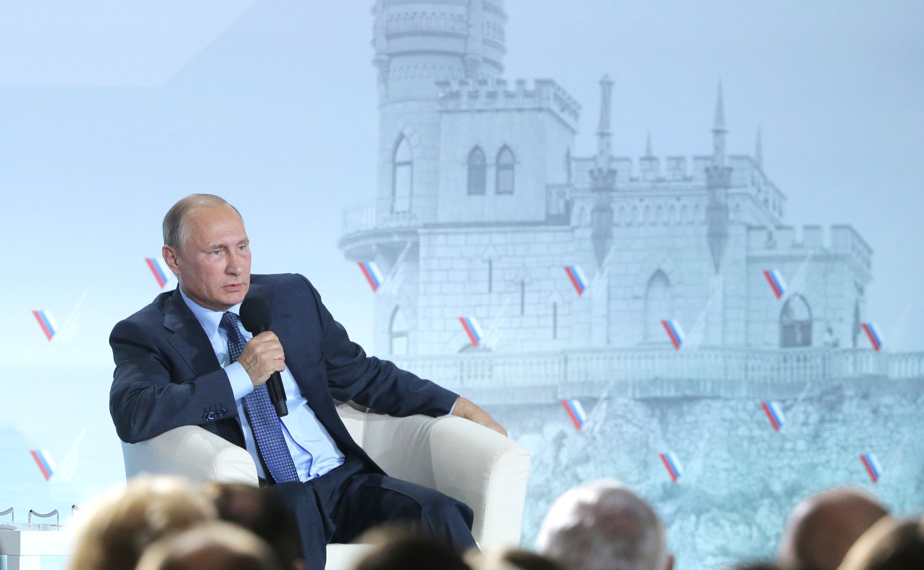 Владимир Путин участвует в "Форуме действий" Фото МИхаила Метцеля / kremlin.ru Между тем в Крыму, по понятным причинам, Владимир Путин может и хотел бы высказываться только о внутренних делах, но тема Украины так или иначе почти всегда затрагивается. Так и на этот раз, выступая на форуме ОНФ, Путин затронул историю с энергоблокадой Крыма в ноябре, назвав ее организаторов «удивительными идиотами».