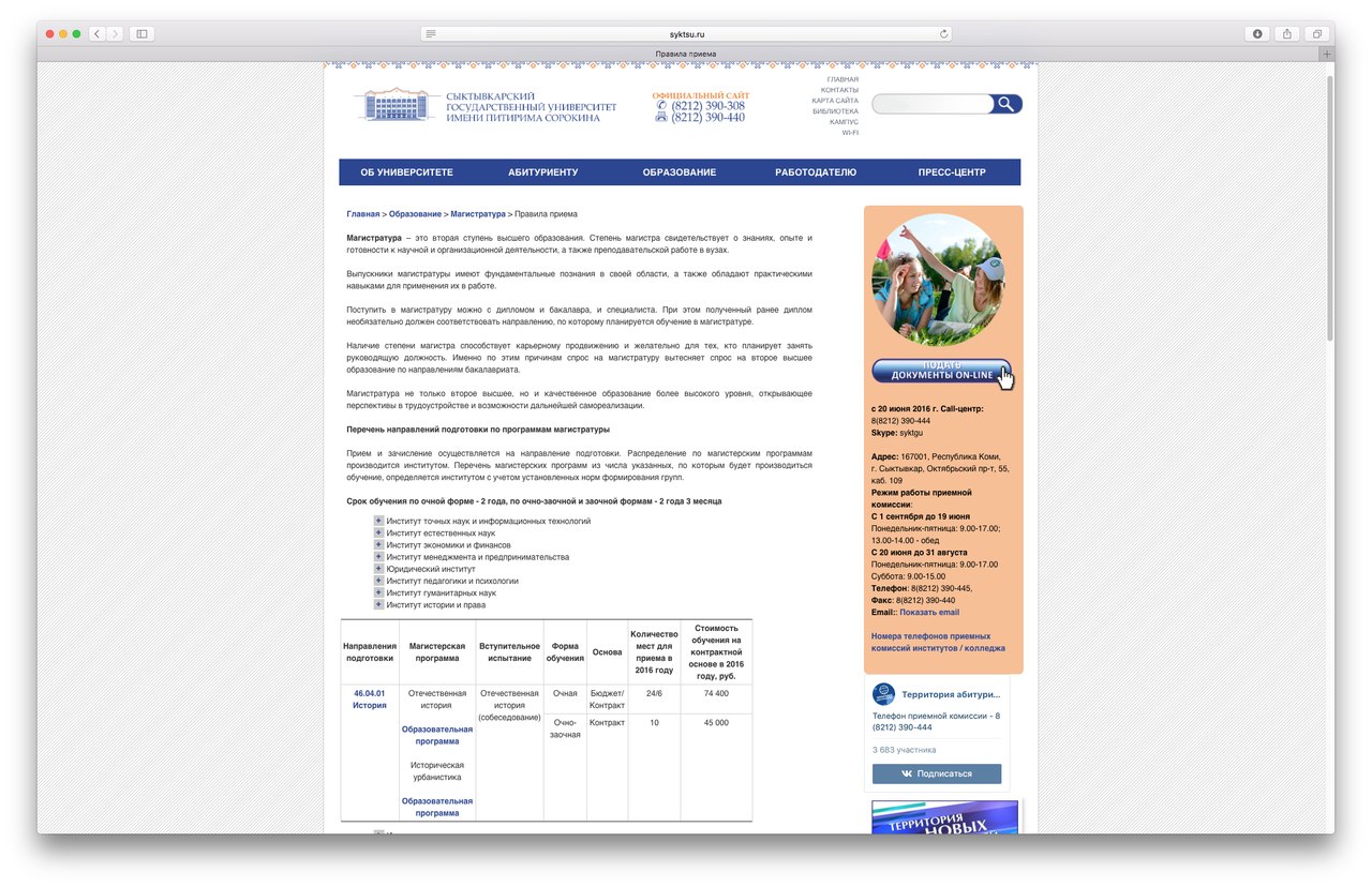Ещё с момента полноценного введения ЕГЭ ведущему усть-сысольскому вузу стало сложно конкурировать за внимание абитуриентов бакалавриата. В последние годы, вслед за всё продолжающимся падением качества образования в СГУ и ростом контрольных цифр приёма (КЦП) в приличных вузах, это коснулось и магистратуры. Видимо, поэтому, чтобы хоть как-то объяснить вчерашним выпускникам бакалавриата истфака СГУ необходимость и дальше оставаться в стенах alma mater, его [истфака] нынешнее руководство во главе с Любовью Максимовой придумало открыть магистерскую программу «Историческая урбанистика». А то урбанистов в городе развелось сверх меры, но все какие-то неправильные — необразованные, наверное. Конкурс при этом решили сделать единый с обычной программой по отечественной истории, чтобы не мудрить.