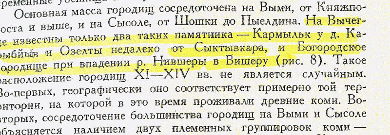 В Корткеросском районе, в трех километрах от села Богородск по дороге Пасвомын- Троицк, где дорога подступает к реке Нившера, есть древнее городище- Кармыльк. Местность представляет боровую террасу, высотой девять метров и имеет форму песчаного насыпного неправильного четырехугольника 90 на 50 метров. По бокам холма протекают ручьи. На спуске к правому ручью со стороны дороги заметен след вала, простирающийся 84 метра на северо- восток. В центре- растет сосна с раздвоенной вершиной (вожа пу- дерево, почитаемое в мифологии коми).