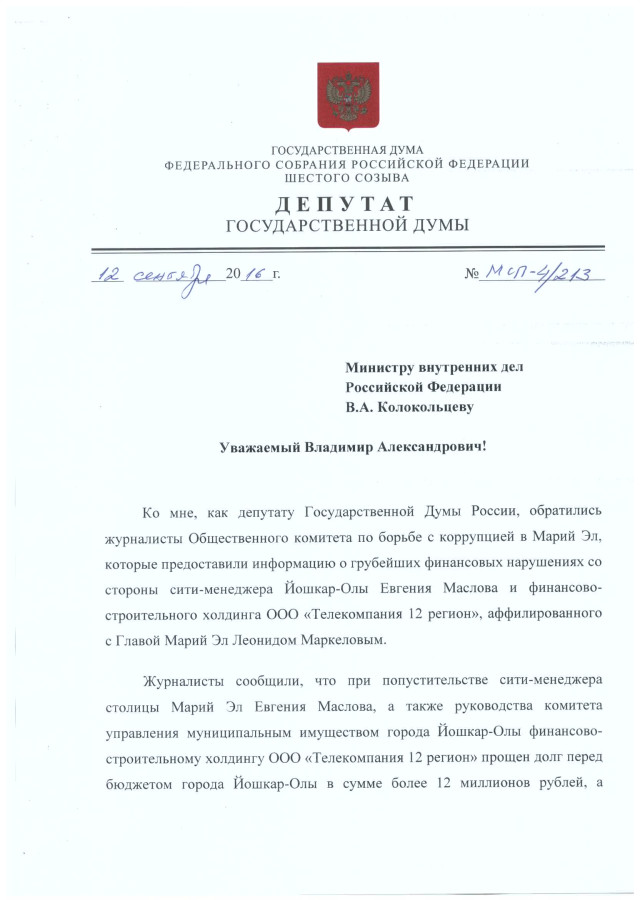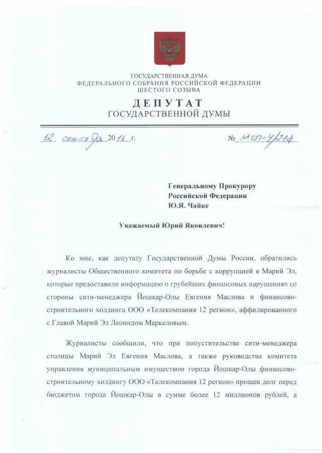 PS: В середине сентября 2016 года депутат Госдумы VI созыва Сергей Мамаев направил официальные запросы в Генеральную прокуратуру и Следственный комитет России по фактам незаконного списания 20 миллионов рублей мэром Йошкар-Олы Евгением Масловым госдолга за аренду земли “Телекомпании 12 регион”, которая принадлежит близкой родственнице Главы Марий Эл Леонида Маркелова.