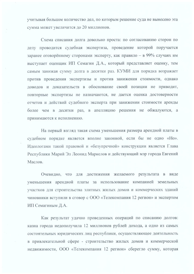 Очевидно, что для достижения желаемого результата в виде уменьшения арендной платы за использование компанией земельных участков для строительства элитных жилых домов и коммерческих зданий чиновники вступили в сговор с ООО «Телекомпания 12 регион» и экспертом ИП Семагиным Д.А.