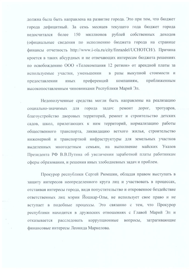 За семь месяцев текущего года бюджет города недосчитался более 150 миллионов рублей собственных доходов (официальные сведения по исполнению бюджета города на странице финансы отчетность http://www.i-ola.ru/city/finrazdel/UCHOTCH/). Причина кроется в таких абсурдных и не отвечающих интересам бюджета решениях по освобождению ООО «Телекомпания 12 регион» от арендной платы за используемые участки, уменьшении в разы выкупной стоимости и предоставлении иных преференций компаниям, приближенным высокопоставленным чиновниками Республики Марий Эл.