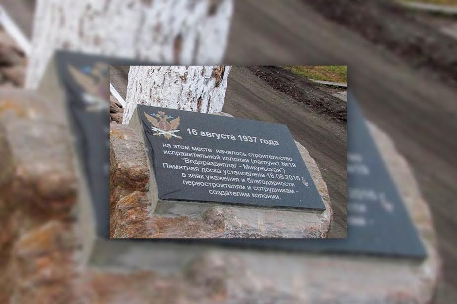 Памятная табличка была открыта 19 августа 2016 года. В церемонии принял участие ветеран учреждения Валерий Воронюк и выпускница Вологодского ИПЭ, старший инженер производственного отдела Анастасия Куликова. Исправительная колония ИК-31 в городе Микунь была основана 16 августа 1937 года, тогда исправительное учреждение называлось лесозаготовительным лагерем Усть-Вымский. Лагпункт № 19 «Водоразделлаг — Микуньская» был основан по приказу народного комиссара НКВД Николая Ежова (репрессированного в 1938 году).
