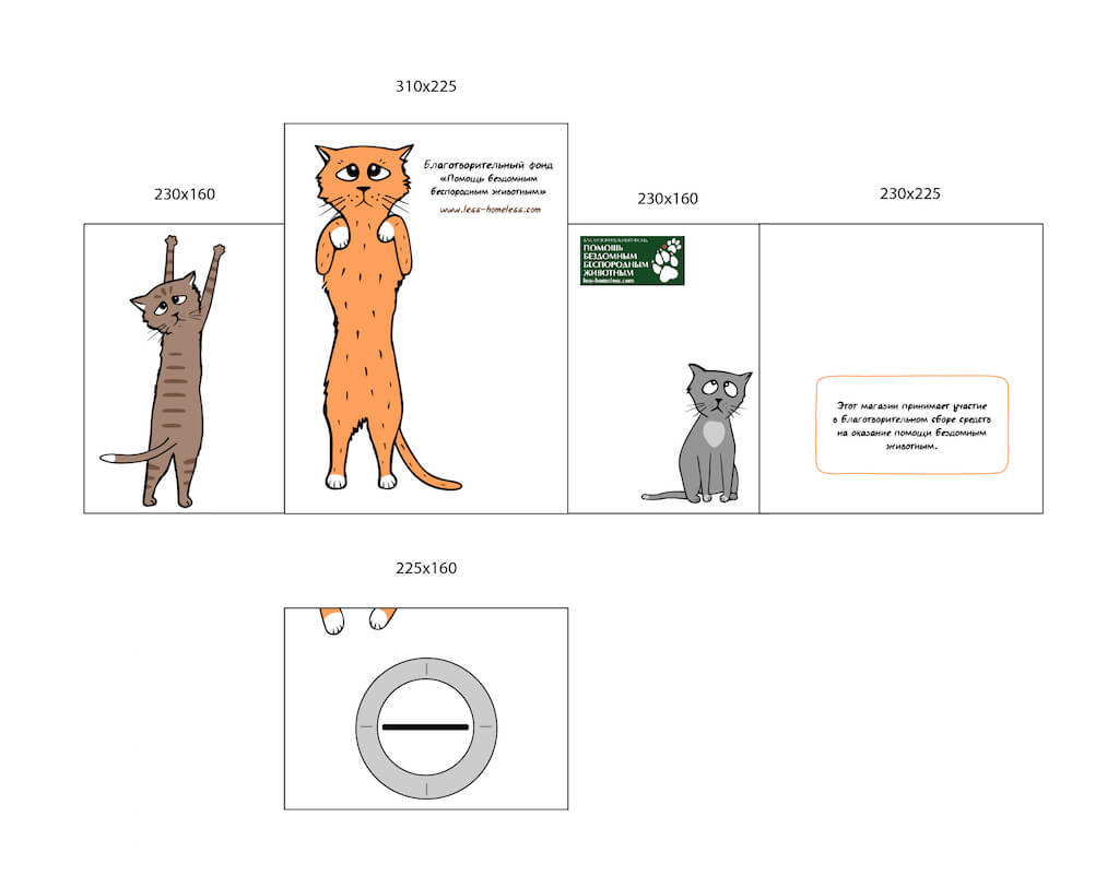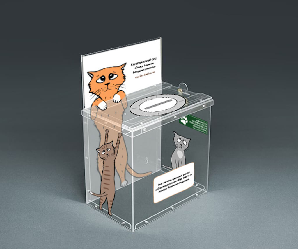 Боксы нужны для установки в зоомагазинах, ветклиниках и грумерских салонах. Главные требования к дизайну боксов – они должны вызвать у менеджеров магазинов желание поставить у себя красивую, оригинальную копилку и привлечь внимание посетителей, побуждая сделать пожертвование.