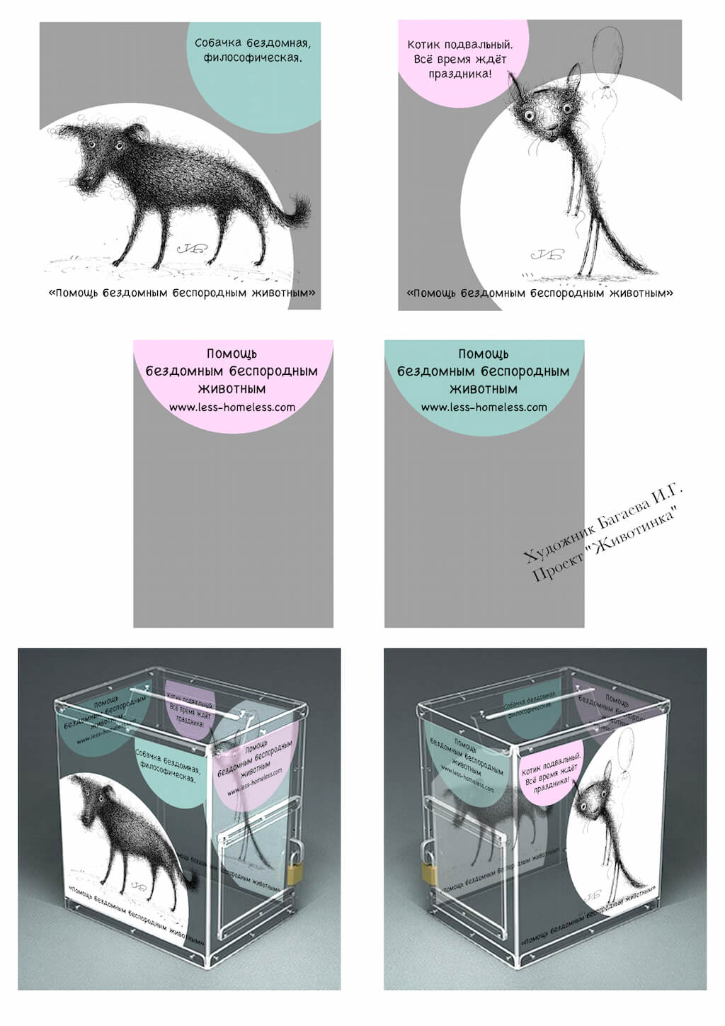 «Для создания дизайна копилок для бездомных животных я использовала иллюстрации из своего авторского проекта под названием «Животинки», это для меня абсолютно творческий проект, мне очень нравится создавать характерных животных, наделяя их человеческими качествами и привычками. И то, что мои нарисованные животинки принесут пользу настоящим живым, радует меня бесконечно». Инна Багаева