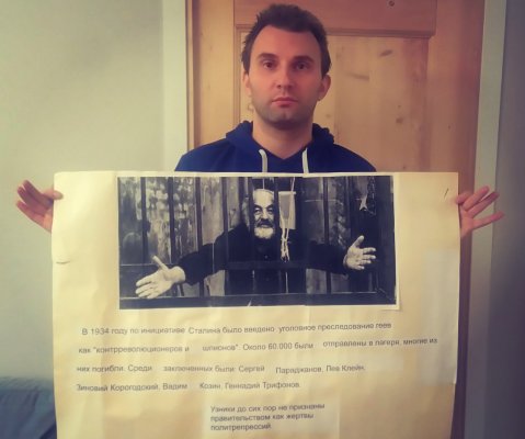 Во время акции Воскресенский держал в руках радужный флаг и плакат, посвященный репрессированным в советское время по обвинению в мужеложстве.