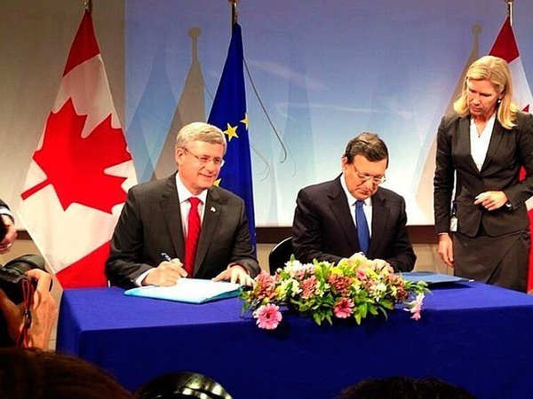Подписание торгового соглашения между ЕС и Канадой ctvnews.ca В воскресенье ЕС и Канада подписали торговое соглашение, которое на протяжении нескольких последних недель находилось под угрозой срыва. Многие комментаторы называют это событие «эпохальными», однако сомневаются в том, что за этим соглашением могут последовать другие аналогичные.