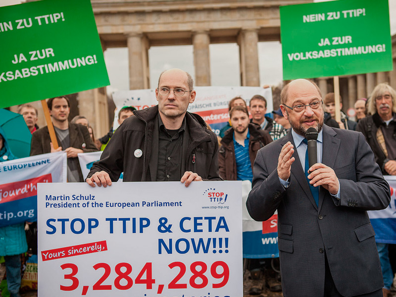 Демонстрация против Трансатлантического торгового партнерства / wikiwand.com Перспективы подписания соглашения с Канадой тоже до последнего момента были неопределенными. Этому проекту воспротивился бельгийский регион Валлония, где фермеры опасались, что сделка поставит их в невыгодное положение из-за увеличения конкуренции с канадскими производителями. Из-за этого бельгийское правительство не могло одобрить соглашение, а ЕС, в свою очередь, не мог его подписать. Только в минувшую пятницу руководству страны удалось набрать необходимое число голосов в поддержку проекта.