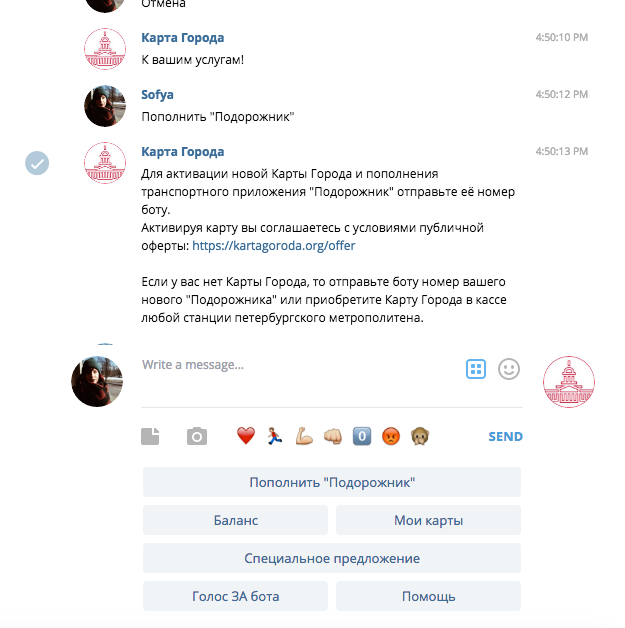 Пользователи «Карты города», с помощью которой оплачивают проезд в общественном транспорте и получают скидки в торговых сетях и ресторанах, могут пополнять проездной через бота, выбрав функцию «пополнить „Подорожник“». В случае оплаты обычного «Подорожника», не прикрепленного к «Карте города», взимается комиссия 3 %. Также бот сообщает о скидках и специальных предложениях в заведениях города по карте.