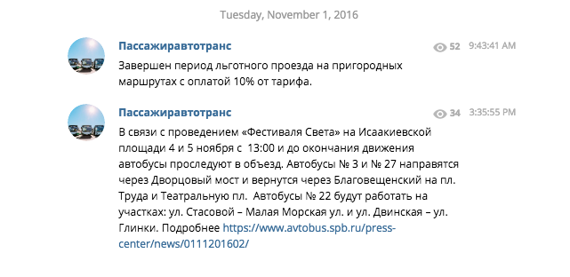 Предприятие запустило канал в Telegram в прошлые выходные. Пока в нем опубликованы три новости: о работе ночных автобусов в связи с Днем народного единства, завершении льготного проезда на пригородных маршрутах и об изменении маршрутов городских автобусов из-за «Фестиваля света».
