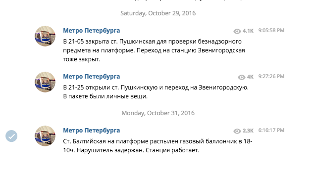 Метрополитен 21 октября запустил канал, где рассылает информацию о времени и причинах закрытия станций. Если станцию блокировали из-за бесхозного пакета, на канале сообщают, что именно забыли в подземке.