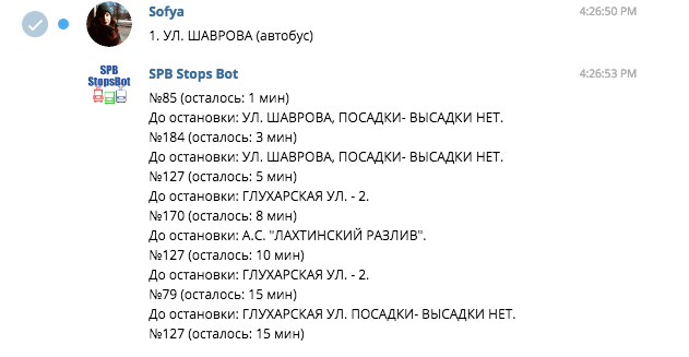 Еще один бот для отслеживания наземного транспорта. Сперва нужно выслать ему свое местоположение, после чего бот высылает карту с отмеченными ближайшими остановками. Затем он предлагает выбрать одну из остановок и присылает список автобусов и троллейбусов со временем их прибытия. Здесь можно тоже отрегулировать поиск по нужному радиусу.