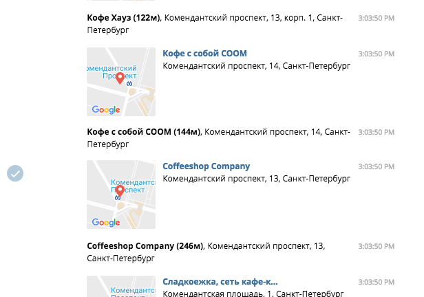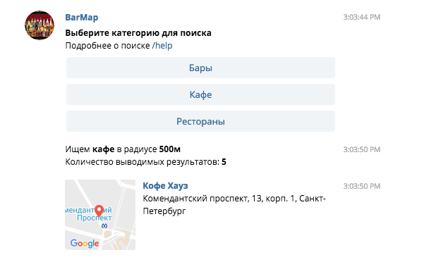 Удобный бот для тех, кому лень копаться в навигаторах. Нужно отправить боту команду help и свое местонахождение. Затем выбрать поиск по барам, кафе или ресторанам. По умолчанию бот находит заведения в радиусе 500 метров, но можно настроить его и на поиск по большему радиусу.
