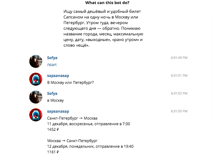 Бот собирает данные обо всех доступных билетах на скоростные поезда и предлагает самые удобные варианты. Боту можно написать, что нужен вариант на утро или вечер, он примет данные и пришлет информацию о нужных билетах.