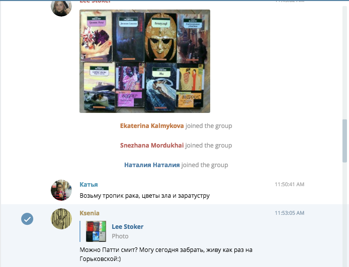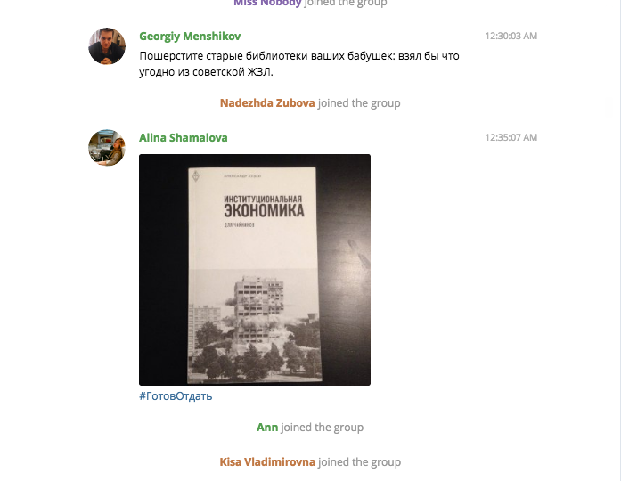 В чате, созданном петербуржцами в начале октября, пользователи обмениваются научной и художественной литературой на русском и английском языках, а также комиксами. Участники пишут названия книг, которыми готовы поделиться, с хэштегом #готовотдать и объявления о поиске книг с хэштегом #ищукниги.