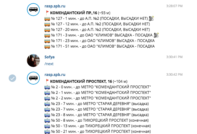 Бот, созданный «Организатором перевозок», сообщает время ожидания автобуса, троллейбуса или трамвая. Для того чтобы воспользоваться им, нужно отправить команду start, затем выбрать английский или русский язык для получения сообщений и сразу отправить свою геолокацию. Попросить бота выслать дополнительную информацию можно с помощью команды next.