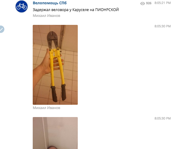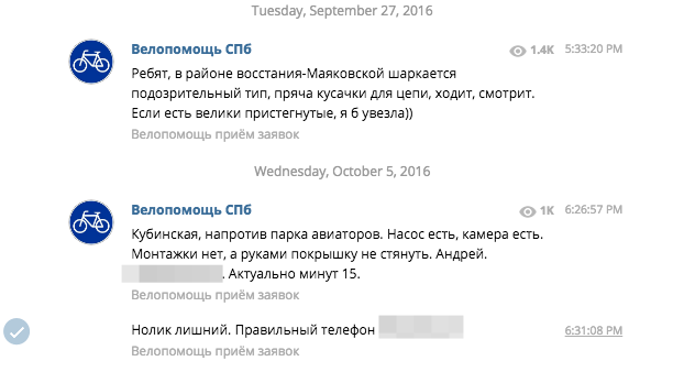 Здесь публикуют просьбы о помощи петербургских велосипедистов, которые попали в ДТП или столкнулись с другими транспортными проблемами. Для того чтобы отправить объявление, нужно указать свою геолокацию, а также описать проблему и сформулировать просьбу на @bikehelp. Администраторы также просят обратившимся за помощью указывать в объявлении номер телефона и имя. Иногда публикуют актуальную и интересную для велосипедистов информацию.