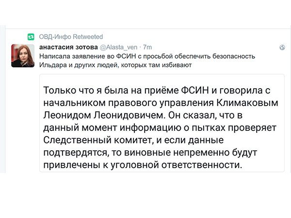 «Я чувствовала что-то неладное: Ильдару не давали связаться со мной по телефону, не пускали и с ним на свидание. Чутье меня не обмануло, только вот оказалось всё намного хуже, чем я могла подумать: начальник ИК-7 в Карелии Сергей Коссиев напрямую угрожает убить моего мужа», – написала Анастасия Зотова в своем Фейсбуке. – «Я знаю, это правда, потому что Ильдар никогда не стал бы меня волновать без причины: если он сообщает, что его постоянно избивают и вряд ли он проживет дольше недели – значит, дело исключительно серьёзное».