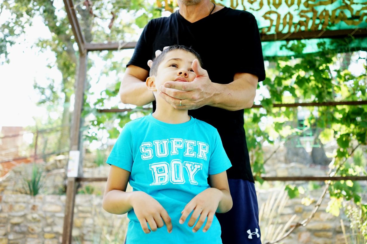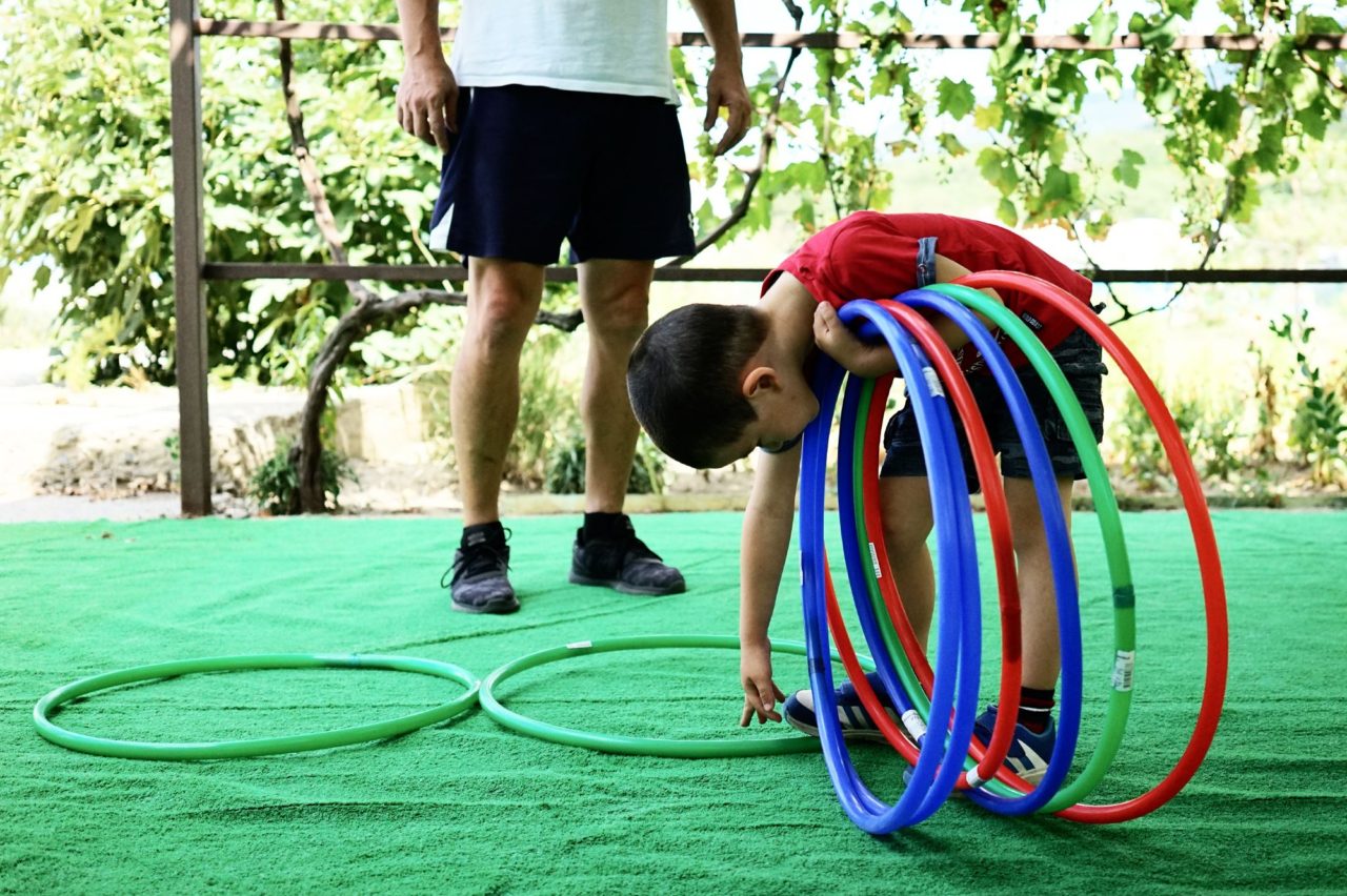 Тэоман выполняет упражнение — нужно собрать конусы на руку. Так он учится смотреть косым взглядом — видеть, что находится под носом. А еще это помогает обретению равновесияФото: Алина Иноземцева А сейчас Тэоман и его мама, Алия, тут, в лагере.