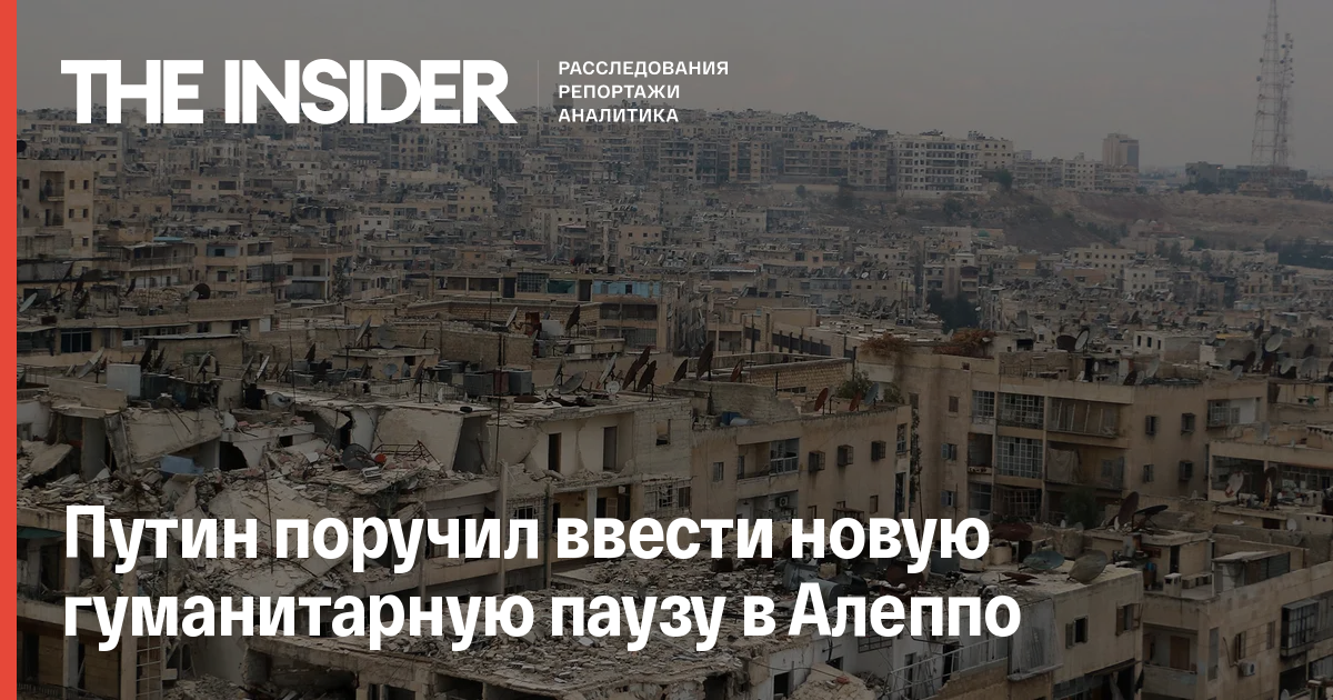 Президент России Владимир Путин поручил ввести новую гуманитарную паузу в Алеппо «во избежание бессмысленных жертв». Как передает РБК со ссылкой на сообщение Минобороны, пауза будет объявлена 4 ноября. Она продлится с 9 до 19 часов.