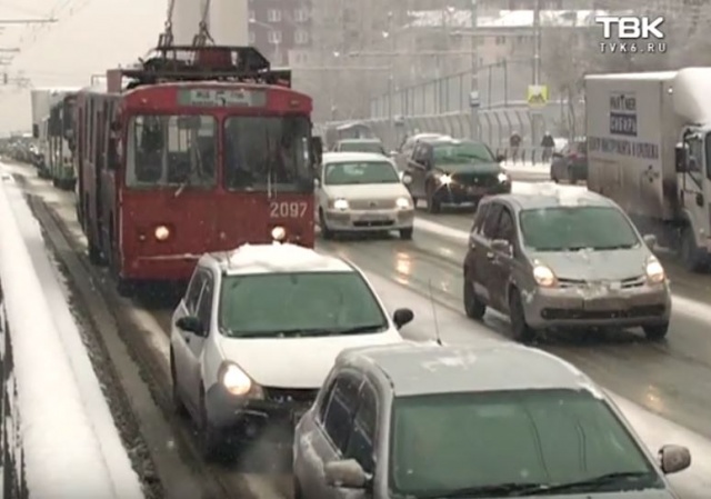 Из-за снегопада улицы Красноярска утром встали в 9-балльные пробки. Многие опоздали на работу.