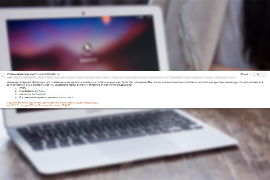 В общей рассылке для аспирантов Сыктывкарского государственного университета имени Питирима Сорокина 30 сентября появилось письмо следующего содержания: «Уважаемые аспиранты! Напоминаем, что с завтрашнего дня мы должны перевести (отчислить) на след. курс. Более того, напоминаем Вам, что мы находимся в процессе подготовки к аккредитации программ аспирантуры. Под угрозой находятся военнообязанные очные аспиранты. Поэтому убедительно просим Вас срочно привести в порядок отчетные документы: 1) отчет, 2) индивидуальный план, 3) сканы инд. достижений. 4) Контрактные аспиранты — срочно оплатить долги».