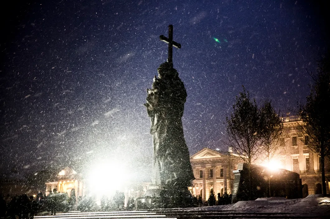 Когда националисты — около тридцати человек — собрались на Красной площади, уже вечерело, брусчатку заметал снег. На площади все еще возвышались роскошные декорации митинга в честь дня народного единства, который прошел здесь утром. ГУМ закрывала гигантская сцена будто бы в красном бархате.